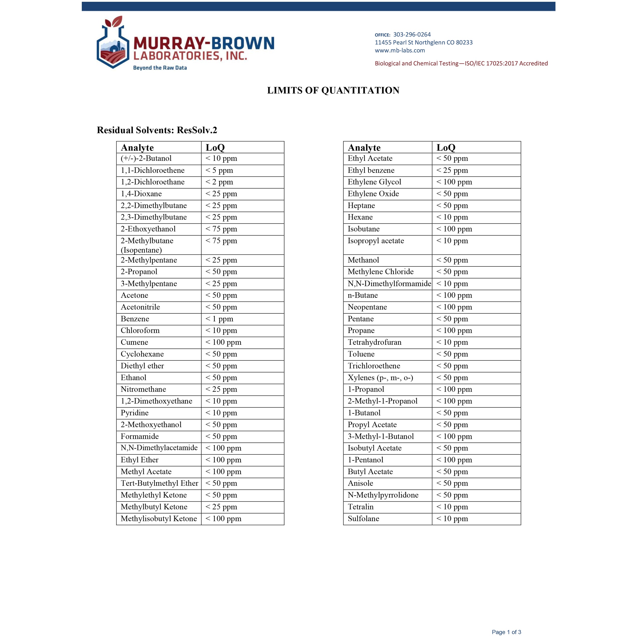 LabReport (#656) Delete Back to listing Edit Name CBD Full Spectrum Relief & Relax Softgels COA4 Sample Name Residual Solvent Analysis Report Sample Matrix Cannabis Extract Product Type cannabis Lab Name Sample Laboratory Inc. Matching Name CBD Full Spectrum Relief & Relax Softgels COA4 Residual Solvent Analysis Report Cannabis Extract External Url https://purecbdnc.com/cdn/shop/files/CBDistillery_CBD-Full-Spectrum-Relief-_-Relax-Softgels-30mgCOA4_3735d84c-d65f-49ae-9609-35e32538bb0a.jpg?v=1742234264 Internal Url https://cbdextract.nw.agency/lab-reports/CBDFullSpectrumRelief&RelaxSoftgelsCOA4.jpg Category Null Type jpg Project pure cbd [ 104 ] State Processed Additional Data Extraction Date: 2023-10-15 Expiry Date: Delta-9 %: 0 THC-A %: 0 Total THC %: 0 D9/THC-A %: 0 Debug Data Null Markdown Content "# LIMITS OF QUANTITATION\n\n## Residual Solvents: ResSolv.2\n\n| Analyte | LoQ | Analyte | LoQ |\n| --------------------------- | --------- | --------------------- | --------- |\n| (+\/-)-2-Butanol | < 10 ppm | Ethyl Acetate | < 50 ppm |\n| 1,1-Dichloroethene | < 5 ppm | Ethyl benzene | < 25 ppm |\n| 1,2-Dichloroethane | < 2 ppm | Ethylene Glycol | < 100 ppm |\n| 1,4-Dioxane | < 25 ppm | Ethylene Oxide | < 50 ppm |\n| 2,2-Dimethylbutane | < 25 ppm | Heptane | < 50 ppm |\n| 2,3-Dimethylbutane | < 25 ppm | Hexane | < 10 ppm |\n| 2-Ethoxyethanol | < 25 ppm | Isobutane | < 100 ppm |\n| 2-Methylbutane (Isopentane) | < 75 ppm | Isopropyl acetate | < 10 ppm |\n| 2-Methylpentane | < 25 ppm | Methanol | < 50 ppm |\n| 2-Propanol | < 50 ppm | Methylene Chloride | < 50 ppm |\n| 3-Methylpentane | < 25 ppm | N,N-Dimethylformamide | < 10 ppm |\n| Acetone | < 50 ppm | n-Butane | < 100 ppm |\n| Acetonitrile | < 50 ppm | Neopentane | < 100 ppm |\n| Benzene | < 1 ppm | Pentane | < 50 ppm |\n| Chloroform | < 10 ppm | Propane | < 100 ppm |\n| Cumene | < 100 ppm | Tetrahydrofuran | < 10 ppm |\n| Cyclohexane | < 50 ppm | Toluene | < 50 ppm |\n| Diethyl ether | < 50 ppm | Trichloroethene | < 50 ppm |\n| Ethanol | < 50 ppm | Xylenes (p-, m-, o-) | < 50 ppm |\n| Nitromethane | < 25 ppm | 1-Propanol | < 100 ppm |\n| 1,2-Dimethoxyethane | < 10 ppm | 2-Methyl-1-Propanol | < 100 ppm |\n| Pyridine | < 10 ppm | 1-Butanol | < 50 ppm |\n| 2-Methoxyethanol | < 50 ppm | Propyl Acetate | < 50 ppm |\n| Formamide | < 50 ppm | 3-Methyl-1-Butanol | < 100 ppm |\n| N,N-Dimethylacetamide | < 100 ppm | Isobutyl Acetate | < 50 ppm |\n| Ethyl Ether | < 100 ppm | 1-Pentanol | < 100 ppm |\n| Methyl Acetate | < 100 ppm | Butyl Acetate | < 50 ppm |\n| Tert-Butylmethyl Ether | < 50 ppm | Anisole | < 50 ppm |\n| Methylbutyl Ketone | < 50 ppm | N-Methylpyrrolidone | < 50 ppm |\n| Methylbutyl Ketone | < 25 ppm | Tetralin | < 10 ppm |\n| Methylisobutyl Ketone | < 100 ppm | Sulfolane | < 10 ppm |\n" Do you really want to delete this item? There is no undo for this operation.