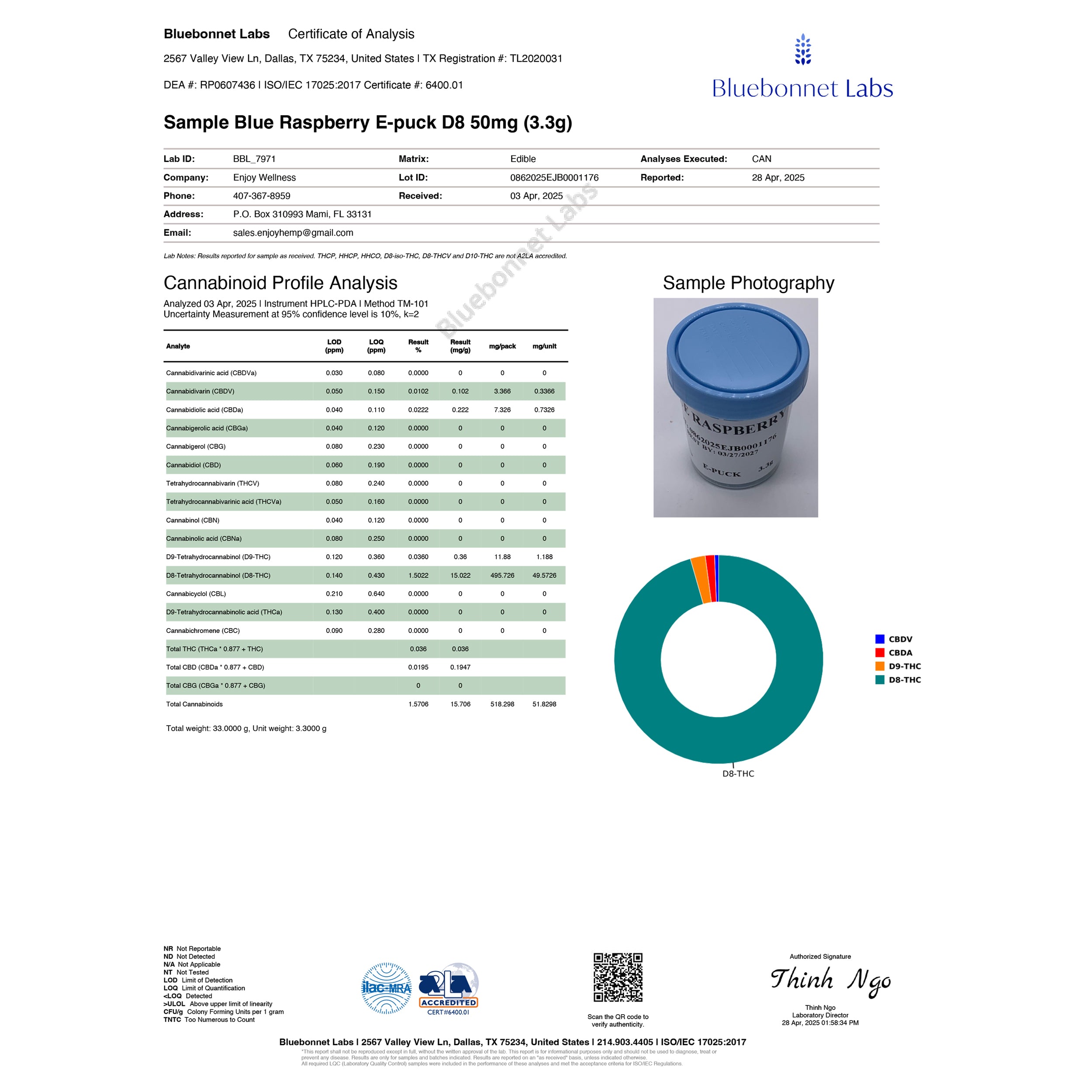 LabReport (#666) Delete Back to listing Edit Name COA Page 1 Sample Name Blue Raspberry E-puck D8 50mg (3.3g) Sample Matrix Edible Product Type cannabis Lab Name Bluebonnet Labs Matching Name COA Page 1 Blue Raspberry E-puck D8 50mg (3.3g) Edible External Url https://purecbdnc.com/cdn/shop/files/EnjoyHemp_EuphoriaDelta8THCLiveResinGummies2000mg-BlueRaspberry_Sativa_-40ct-2025-04-28COA1.jpg Internal Url https://cbdextract.nw.agency/lab-reports/COAPage1.jpg Category Null Type jpg Project pure cbd [ 104 ] State Processed Additional Data Extraction Date: 2025-04-05 Expiry Date: Delta-9 %: 0 THC-A %: 0 Total THC %: 0 D9/THC-A %: 0 Debug Data Null Markdown Content "# Bluebonnet Labs Certificate of Analysis\n\n2567 Valley View Ln, Dallas, TX 75234, United States | TX Registration #: TL2020031 \nDEA #: RP0607436 | ISO\/IEC 17025:2017 Certificate #: 6400.01\n\n## Sample Blue Raspberry E-puck D8 50mg (3.3g)\n\n| Lab ID | BBL_7971 | Matrix: Edible | Analyses Executed: CAN |\n|------------|-------------------|----------------|------------------------|\n| Company | Enjoy Wellness | Lot ID: 060820SEJBL0001716 | Reported: 28 Apr, 2025 |\n| Phone | 407-867-8509 | Received: 05 Apr, 2025 | |\n| Address | P.O. Box 310003 Miami, FL 33131 | | |\n| Email | sales.enjoymgmt@gmail.com | | |\n\n*Note: Results reported in mg\/g or percent (%, w\/w). ND = None Detected. LOD = Limit of Detection. LOQ = Limit of Quantitation.*\n\n## Cannabinoid Profile Analysis\n\nAnalyzed on 05 Apr, 2025 | Instrument: HPLC-PDA | Method: TM-101 \nUncertainty Measurement at 95% confidence level is 10%, k=2\n\n| Cannabinoids | LOD | LOQ | Result | mg\/unit | %weight |\n|-----------------------------------|------|------|--------|---------|---------|\n| Cannabidivarin (CBDV) | 0.200| 0.500| 0.000 | 0 | 0 |\n| Cannabidivarinic acid (CBDVA) | 0.200| 0.500| 0.000 | 0 | 0 |\n| Cannabigerol (CBG) | 0.200| 0.500| 0.000 | 0 | 0 |\n| Cannabigerolic acid (CBGA) | 0.200| 0.500| 0.000 | 0 | 0 |\n| Cannabidiol (CBD) | 0.200| 0.500| 0.000 | 0 | 0 |\n| Cannabidiolic acid (CBDA) | 0.200| 0.500| 0.000 | 0 | 0 |\n| Cannabinol (CBN) | 0.200| 0.500| 0.000 | 0 | 0 |\n| \u03949-Tetrahydrocannabinol (\u03949-THC) | 0.200| 0.500| 0.000 | 0 | 0 |\n| Tetrahydrocannabinolic acid (THCA) | 0.200| 0.500| 0.000 | 0 | 0 |\n| Cannabichromene (CBC) | 0.200| 0.500| 0.000 | 0 | 0 |\n| Cannabidiolic acid (CBDA) | 0.200| 0.500| 0.000 | 0 | 0 |\n| \u03948-Tetrahydrocannabinol (\u03948-THC) | 0.10 | 0.250| 9.350 | 0.0002 | 0 |\n| \u03949-Tetrahydrocannabinolic acid (\u03949-THCA) | 0.10 | 0.250| 0.0002 | 0 | 0 |\n| Cannabicyclol (CBL) | 0.200| 0.500| 0.000 | 0 | 0 |\n| \u03949-Tetrahydrocannabivarin (\u03949-THCV) | 0.200| 0.500| 0.000 | 0 | 0 |\n\n### Total Cannabinoids\n\n- Total THC (\u03949-THC + THCA): 0.0002 mg\/g\n- Total CBD (CBD + CBDA): 0.000 mg\/g\n- Total CBC (CBCA + CBC): 0.000 mg\/g\n- Total Cannabinoids: 1.7476 mg\/g, 16.58 mg\/unit, 35.4948 % weight\n\nTotal weight: 35.0000 g, Unit weight: 3.3000 g\n\n----\n\n## Sample Photography\n\n!Sample Photography\n\n## Cannabinoid Distribution Chart\n\n| Cannabinoid | Color |\n|-------------|-------|\n| CBDV | Blue |\n| CBDA | Red |\n| \u03949-THC | Yellow|\n| \u03948-THC | Green |\n\n----\n\nBluebonnet Labs | 2567 Valley View Ln, Dallas, TX 75234, United States | 214.930.4405 | ISO\/IEC 17025:2017\n\nAuthorized Signature: \n**Thinh Ngo** \nLab Technician \nDate: 28 Apr, 2025 10:34 AM" Do you really want to delete this item? There is no undo for this operation.