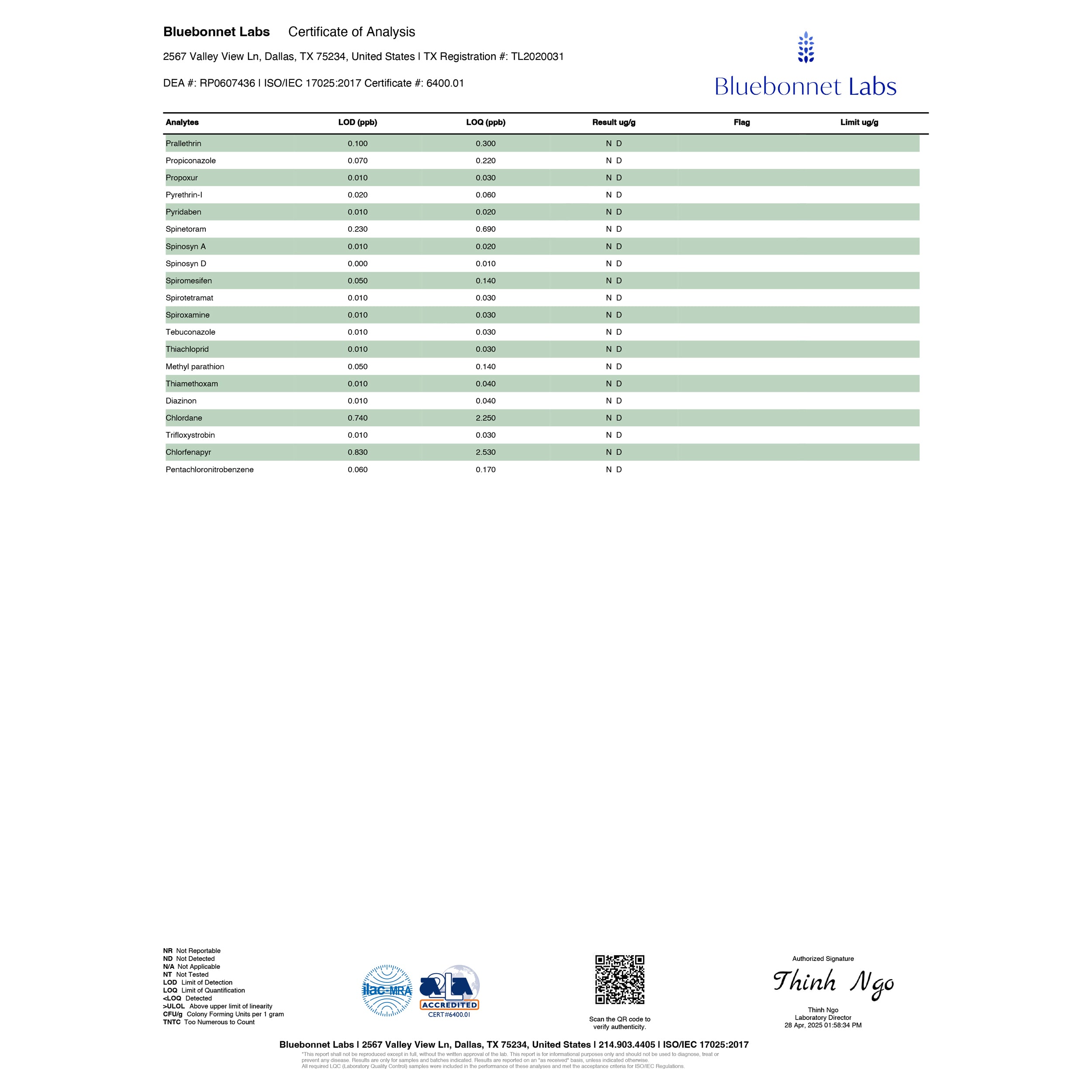 LabReport (#669) Delete Back to listing Edit Name COA Page 4 Sample Name Unnamed Cannabis Product Sample Matrix mushroom extract Product Type mushroom Lab Name Bluebonnet Labs Matching Name COA Page 4 Unnamed Cannabis Product mushroom extract External Url https://purecbdnc.com/cdn/shop/files/EnjoyHemp_EuphoriaDelta8THCLiveResinGummies2000mg-BlueRaspberry_Sativa_-40ct-2025-04-28COA4.jpg Internal Url https://cbdextract.nw.agency/lab-reports/COAPage4.jpg Category Null Type jpg Project pure cbd [ 104 ] State Processed Additional Data Extraction Date: 2023-10-25 Expiry Date: Delta-9 %: 0 THC-A %: 0 Total THC %: 0 D9/THC-A %: 0 Debug Data Null Markdown Content "# Bluebonnet Labs Certificate of Analysis\n\n2567 Valley View Ln, Dallas, TX 75234, United States | TX Registration #: TL220031\n\nDEA #: PR0607436 | ISO\/IEC 17025:2017 Certificate #: 6400.01\n\n| Analyte | LOQ (ppb) | LOD (ppb) | Result (\u00b5g\/g) | Flag | Limit \u00b5g\/g |\n|-------------------------------|-----------|-----------|---------------|------|------------|\n| Psilocin | 0.070 | 0.030 | N D | | |\n| Psilocybin | 0.170 | 0.020 | N D | | |\n| Psilocyne | 0.170 | 0.090 | N D | | |\n| Psychedelin | 0.220 | 0.060 | N D | | |\n| Psilacetin | 0.170 | 0.020 | N D | | |\n| Spiroxatin | 0.230 | 0.090 | N D | | |\n| Spiroxan A | 0.150 | 0.020 | N D | | |\n| Spiroxyn D | 0.200 | 0.015 | N D | | |\n| Spiroxenone | 0.200 | 0.010 | N D | | |\n| Spiroxenol | 0.150 | 0.020 | N D | | |\n| Spiroxenamine | 0.170 | 0.030 | N D | | |\n| Tabunoxane | 0.170 | 0.030 | N D | | |\n| Thiohexol | 0.170 | 0.030 | N D | | |\n| Methyl vanillin | 0.150 | 0.150 | N D | | |\n| Thiohexanone | 0.150 | 0.040 | N D | | |\n| Diazaron | 0.170 | 0.040 | N D | | |\n| Chloroxan | 0.170 | 0.230 | N D | | |\n| Trifluoroxane | 0.150 | 0.050 | N D | | |\n| Chloroxyn | 0.150 | 0.350 | N D | | |\n| Perfluorohexanebenzene | 0.050 | 0.170 | N D | | |\n\n**Key:**\n- N\/D: Not Detectable\n- LOQ: Limit of Quantitation\n- LOD: Limit of Detection\n- \u00b5g\/g: Micrograms per Gram\n- ppb: Parts per Billion\n- CND: Cannot Detect\n- DWG: Dry Weight per Gram\n- THC: Tetrahydrocannabinol\n\n----\n\n**Authorized Signature:**\n\nThinh Ngo\n\nThinh Ngo \nLab Manager \nDate: 10\/25\/23 3:34 PM\n\n----\n\nBluebonnet Labs | 2567 Valley View Ln, Dallas, TX 75234, United States | 214.903.4405 | ISO\/IEC 17025:2017\n\nAccredited by A2LA to ISO\/IEC 17025:2017. The results relate only to the items tested. This report shall not be reproduced except in full, without written approval of the laboratory." Do you really want to delete this item? There is no undo for this operation.