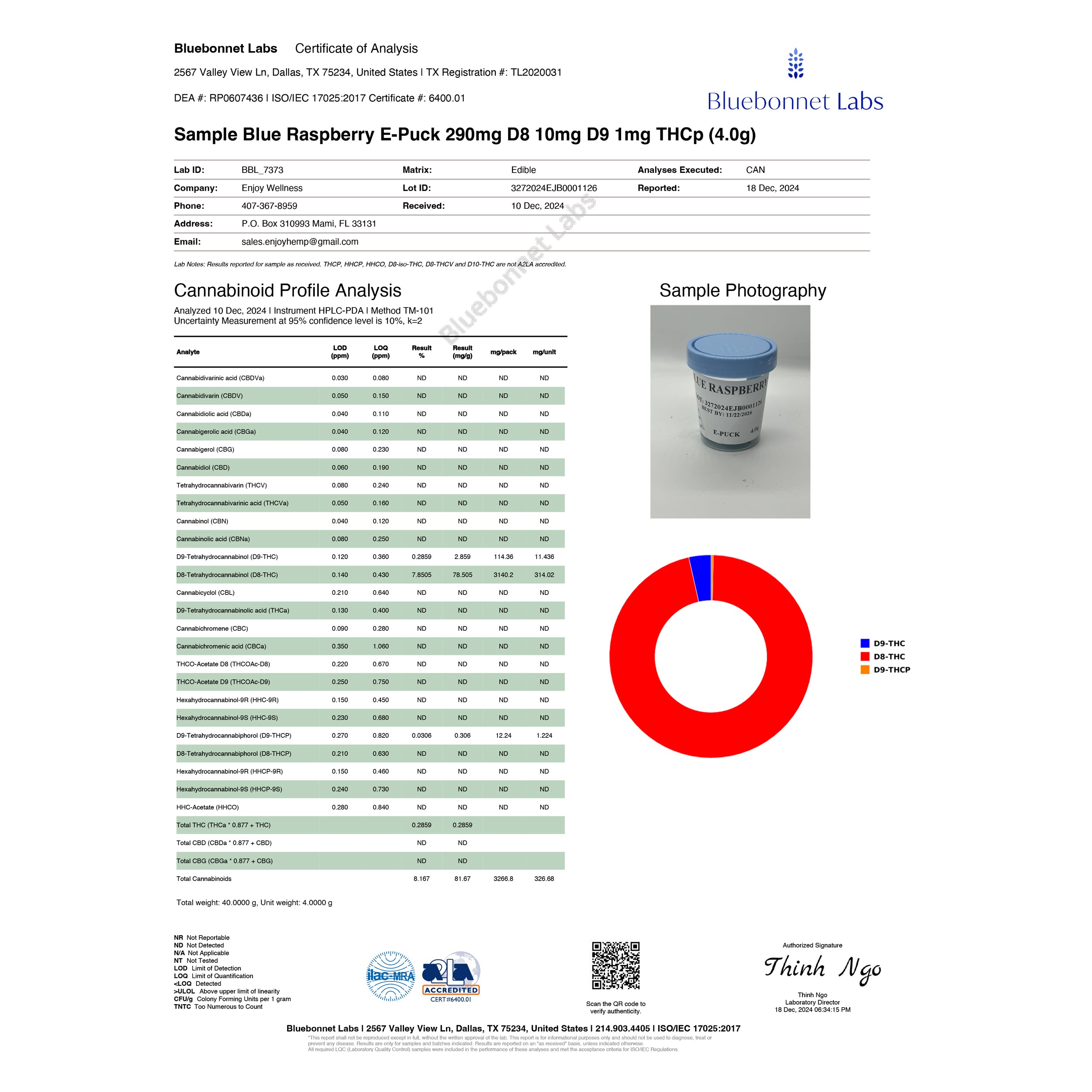 LabReport (#850) Delete Back to listing Edit Name COA Enjoy Hemp D9THC Live Roofing 3000mg Jet Fuel 2024-12-18 Sample Name Blue Raspberry E-Puck 290mg D8 10mg D9 1mg THCp Sample Matrix Edible Product Type cannabis Lab Name Bluebonnet Labs Matching Name COA Enjoy Hemp D9THC Live Roofing 3000mg Jet Fuel 2024-12-18 Blue Raspberry E-Puck 290mg D8 10mg D9 1mg THCp Edible External Url https://purecbdnc.com/cdn/shop/files/COAEnjoyHemp_D9THCLiveR3000mg_JetFuel_2024-12-181.jpg Internal Url https://cbdextract.nw.agency/lab-reports/COAEnjoyHempD9THCLiveRoofing3000mgJetFuel2024-12-18.jpg Category Null Type jpg Project pure cbd [ 104 ] State Processed Additional Data Extraction Date: 2024-12-10 Expiry Date: Delta-9 %: 0.105 THC-A %: 0 Total THC %: 0.105 D9/THC-A %: 0.105 Debug Data Null Markdown Content "# Bluebonnet Labs Certificate of Analysis\n\n2567 Valley View Ln, Dallas, TX 75234, United States | TX Registration #: TL2202031 \nDEA #: RP0067498 | ISO\/IEC 17025:2017 Certificate #: 6400.01\n\n## Sample Blue Raspberry E-Puck 290mg D8 10mg D9 1mg THCp (4.0g)\n\n| Lab ID: | BBL-7373 |\n|---------|----------|\n| Company: | Elev8-Wellness |\n| Phone: | 407-347-9949 |\n| Address: | P.O. Box 931083 Miami, FL 33131 |\n| Email: | splus.ecommpkg@gmail.com |\n\n| Matrix: | Edible |\n|---------|--------|\n| Lot ID: | 8270284EJBB0001136 |\n| Reported: | 18 Dec, 2024 |\n| Received: | 10 Dec, 2024 |\n| Analyses Executed: | CAN |\n\n----\n\n## Cannabinoid Profile Analysis\n\nAnalyzed 09 Dec, 2024 | Instrument: HPLC-PDA | Method TM-10-1 \nUncertainty Measurement at 95% confidence level is 10%, k=2\n\n| Analyte | LOD | LOQ | Result | Result (mg\/g) | Result (mg\/unit) |\n| -------------------------------------------- | ----- | ----- | ------ | ------------- | ---------------- |\n| Cannabichromene (CBC) | 0.010 | 0.030 | ND | ND | ND |\n| Cannabichromenic Acid (CBCA) | 0.010 | 0.030 | ND | ND | ND |\n| Cannabicyclol (CBL) | 0.010 | 0.030 | ND | ND | ND |\n| Cannabicyclolic Acid (CBLA) | 0.010 | 0.030 | ND | ND | ND |\n| Cannabidiol (CBD) | 0.010 | 0.030 | ND | ND | ND |\n| Cannabidiolic Acid (CBDA) | 0.010 | 0.030 | ND | ND | ND |\n| Cannabidivarin (CBDV) | 0.010 | 0.030 | ND | ND | ND |\n| Cannabidivarinic Acid (CBDVA) | 0.010 | 0.030 | ND | ND | ND |\n| Cannabigerol (CBG) | 0.010 | 0.030 | ND | ND | ND |\n| Cannabigerolic Acid (CBGA) | 0.010 | 0.030 | ND | ND | ND |\n| Cannabigerovarin (CBGV) | 0.010 | 0.030 | ND | ND | ND |\n| Cannabigerovarinic Acid (CBGVA) | 0.010 | 0.030 | ND | ND | ND |\n| Cannabinol (CBN) | 0.010 | 0.030 | ND | ND | ND |\n| Cannabinolic Acid (CBNA) | 0.010 | 0.030 | ND | ND | ND |\n| Cannabivarin (CBV) | 0.010 | 0.030 | ND | ND | ND |\n| Cannabivarinic Acid (CBVA) | 0.010 | 0.030 | ND | ND | ND |\n| \u03948-Tetrahydrocannabinol (\u03948-THC) | 0.010 | 0.030 | 2.898 | 0.725 | 2.898 |\n| \u03948-Tetrahydrocannabinolic Acid (\u03948-THCA) | 0.010 | 0.030 | ND | ND | ND |\n| \u03949-Tetrahydrocannabinol (\u03949-THC) | 0.010 | 0.030 | 0.420 | 0.105 | 0.420 |\n| \u03949-Tetrahydrocannabinolic Acid (\u03949-THCA) | 0.010 | 0.030 | ND | ND | ND |\n| \u039410-Tetrahydrocannabinol (\u039410-THC) | 0.010 | 0.030 | ND | ND | ND |\n| \u039410-Tetrahydrocannabinolic Acid (\u039410-THCA) | 0.010 | 0.030 | ND | ND | ND |\n| THCV-Acetate (THCVA) | 0.010 | 0.030 | ND | ND | ND |\n| Tetrahydrocannabivarin (THCV) | 0.010 | 0.030 | ND | ND | ND |\n| Tetrahydrocannabivarinic Acid (THCVA) | 0.010 | 0.030 | ND | ND | ND |\n| \u03949-Tetrahydrocannabiphorol (\u03949-THCP) | 0.010 | 0.030 | 0.130 | 0.033 | 0.130 |\n| \u03949-Tetrahydrocannabiphorolic Acid (\u03949-THCPA) | 0.010 | 0.030 | ND | ND | ND |\n| \u03948-Tetrahydrocannabiphorol (\u03948-THCP) | 0.010 | 0.030 | ND | ND | ND |\n| \u03948-Tetrahydrocannabiphorolic Acid (\u03948-THCPA) | 0.010 | 0.030 | ND | ND | ND |\n| Hexahydrocannabinol (HHC) | 0.010 | 0.030 | 0.420 | 0.105 | 0.420 |\n| Hexahydrocannabinolic Acid (HHCA) | 0.010 | 0.030 | ND | ND | ND |\n| Hexahydrocannabiphorol (HHCP) | 0.010 | 0.030 | 0.420 | 0.105 | 0.420 |\n| Hexahydrocannabiphorolic Acid (HHCPA) | 0.010 | 0.030 | ND | ND | ND |\n| THC-Hemisuccinate (THC-HS) | 0.010 | 0.030 | ND | ND | ND |\n| Total \u03949-THC (\u03949-THC + \u03949-THCA) | 0.010 | 0.030 | 0.420 | 0.105 | 0.420 |\n| Total \u03948-THC (\u03948-THC + \u03948-THCA) | 0.010 | 0.030 | 2.898 | 0.725 | 2.898 |\n| Total CBD (CBD + CBDA) | 0.010 | 0.030 | ND | ND | ND |\n| Total Cannabinoids | | | 6.107 | 1.527 | 6.107 |\n\n\nTotal weight: <4.0000 g, Unit weight: 4.0000 g\n\n----\n\n## Sample Photography\n\n!Sample Photography\n\n----\n\n## Chart\n\n| Component | Color |\n| --------- | ------ |\n| \u03949-THC | Blue |\n| \u03948-THC | Red |\n| \u03949-THCP | Orange |\n\n\n----\n\n**Authorized Signature** \nThinh Ngo \nLab Director \nDate: 18 Dec, 2024\n\n----\n\nBluebonnet Labs | 2567 Valley View Ln, Dallas, TX 75234, United States | 214.630.4405 | ISO\/IEC 17025:2017" Do you really want to delete this item? There is no undo for this operation.