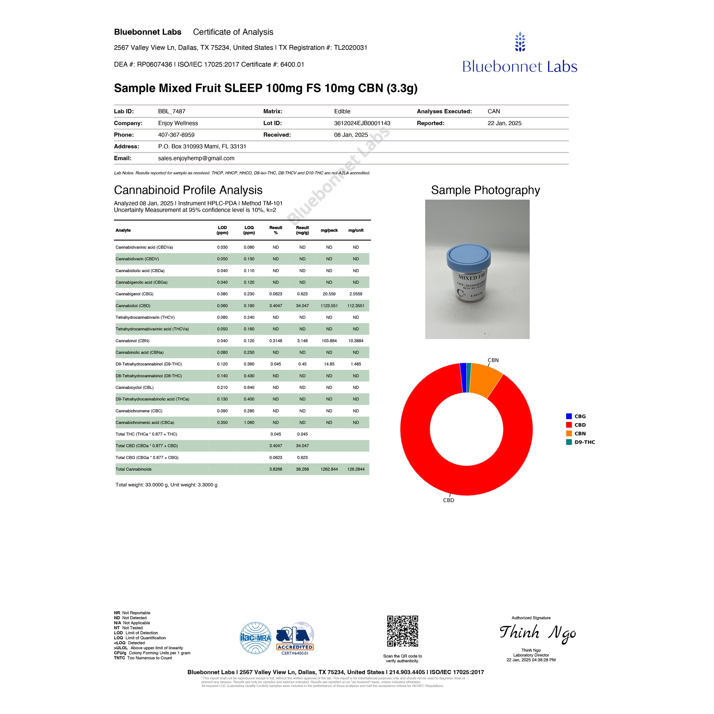 LabReport (#902) Delete Back to listing Edit Name COA-2025-01-22 Part 1 Sample Name Mixed Fruit SLEEP 100mg FS 10mg CBN (3.3g) Sample Matrix Edible Product Type cannabis Lab Name Bluebonnet Labs Matching Name COA-2025-01-22 Part 1 Mixed Fruit SLEEP 100mg FS 10mg CBN (3.3g) Edible External Url https://purecbdnc.com/cdn/shop/files/EnjoyHemp_CBD_CBNSleepFGummies3300mgCOA-2025-01-221.jpg?v=1745855866 Internal Url https://cbdextract.nw.agency/lab-reports/COA-2025-01-22Part1.jpg Category Null Type jpg Project pure cbd [ 104 ] State Processed Additional Data Extraction Date: 2025-01-22 Expiry Date: Delta-9 %: 0.004 THC-A %: 0 Total THC %: 0.004 D9/THC-A %: 0.004 Debug Data Null Markdown Content "# Bluebonnet Labs Certificate of Analysis\n\n2567 Valley View Ln, Dallas, TX 75234, United States | TX Registration #: TL2202031 \nDEA #: RP0067498 | ISO\/IEC 17025:2017 Certificate #: 660.01\n\n## Sample Mixed Fruit SLEEP 100mg FS 10mg CBN (3.3g)\n\n- **Lab ID:** BBL_7467\n- **Matrix:** Edible\n- **Analysis Executed:** CAN\n- **Company:** Enjoy Wellness\n- **Lot ID:** 981204JE_BB001143\n- **Reported:** 22 Jan, 2025\n- **Phone:** 407-987-3899\n- **Received:** 08 Jan, 2025\n- **Address:** P.O. Box 310953 Miami, FL 33131\n- **Email:** sales.enjoyhemp@gmail.com\n\n*Note: Results reported in mg\/g and % w\/w. ND = None Detected. LOD = Limit of Detection. LOQ = Limit of Quantitation.*\n\n## Cannabinoid Profile Analysis\n\nAnalyzed on: 08 Jan, 2025 | Instrument: HPLC-PDA | Method TM-101 \nUncertainty Measurement at 95% confidence level is 10%, k=2\n\n| Analyte | LOD | LOQ | Result (mg\/g) | Result (%) | Amount (mg\/unit) |\n|---------|-----|-----|---------------|------------|------------------|\n| Cannabichromene acid (CBCA) | 0.003 | 0.010 | ND | ND | ND |\n| Cannabichromene (CBC) | 0.003 | 0.010 | ND | ND | ND |\n| Cannabidivarin acid (CBDVA) | 0.003 | 0.010 | ND | ND | ND |\n| Cannabidivarin (CBDV) | 0.003 | 0.010 | ND | ND | ND |\n| Cannabidiolic acid (CBDA) | 0.003 | 0.010 | ND | ND | ND |\n| Cannabidiol (CBD) | 0.010 | 0.030 | 3.030 | 0.303 | 2.2338 |\n| Cannabigerolic acid (CBGA) | 0.003 | 0.010 | ND | ND | ND |\n| Cannabigerol (CBG) | 0.003 | 0.010 | 0.010 | 0.001 | 0.0074 |\n| Cannabinolic acid (CBNA) | 0.003 | 0.010 | ND | ND | ND |\n| Cannabinol (CBN) | 0.010 | 0.030 | 0.910 | 0.091 | 0.6713 |\n| \u03949-Tetrahydrocannabinolic acid (THCA) | 0.010 | 0.030 | ND | ND | ND |\n| \u03949-Tetrahydrocannabinol (\u03949-THC) | 0.010 | 0.030 | 0.040 | 0.004 | 0.0295 |\n| \u03948-Tetrahydrocannabinol (\u03948-THC) | 0.010 | 0.030 | ND | ND | ND |\n| \u03949-Tetrahydrocannabivarin acid (THCVA) | 0.003 | 0.010 | ND | ND | ND |\n| \u03949-Tetrahydrocannabivarin (THCV) | 0.003 | 0.010 | ND | ND | ND |\n| Total THC (THCA * 0.877 + THC) | 0.010 | 0.030 | 0.040 | 0.004 | 0.0295 |\n| Total CBD (CBDA * 0.877 + CBD) | 3.030 | 0.303 | 2.2338 | | |\n| Total CBG (CBGA * 0.877 + CBG) | 0.010 | 0.001 | 0.0074 | | |\n\n**Total weight:** 3.3000 g | Unit weight: 3.3000 g\n\n## Sample Photography\n\n!Sample Photography\n\n## Cannabinoid Distribution\n\n| Cannabinoid | Percentage |\n|-------------|------------|\n| CBG | 0.1% |\n| CBD | 90.9% |\n| CBN | 9.0% |\n| \u03949-THC | 0.0% |\n\n----\n\n**Authorized Signature** \nThinh Ngo \nDate: 22 Jan, 2025 03:00 PM\n\nBluebonnet Labs | 2567 Valley View Ln, Dallas, TX 75234, United States | 214.903.4405 | ISO\/IEC 17025:2017" Do you really want to delete this item? There is no undo for this operation.