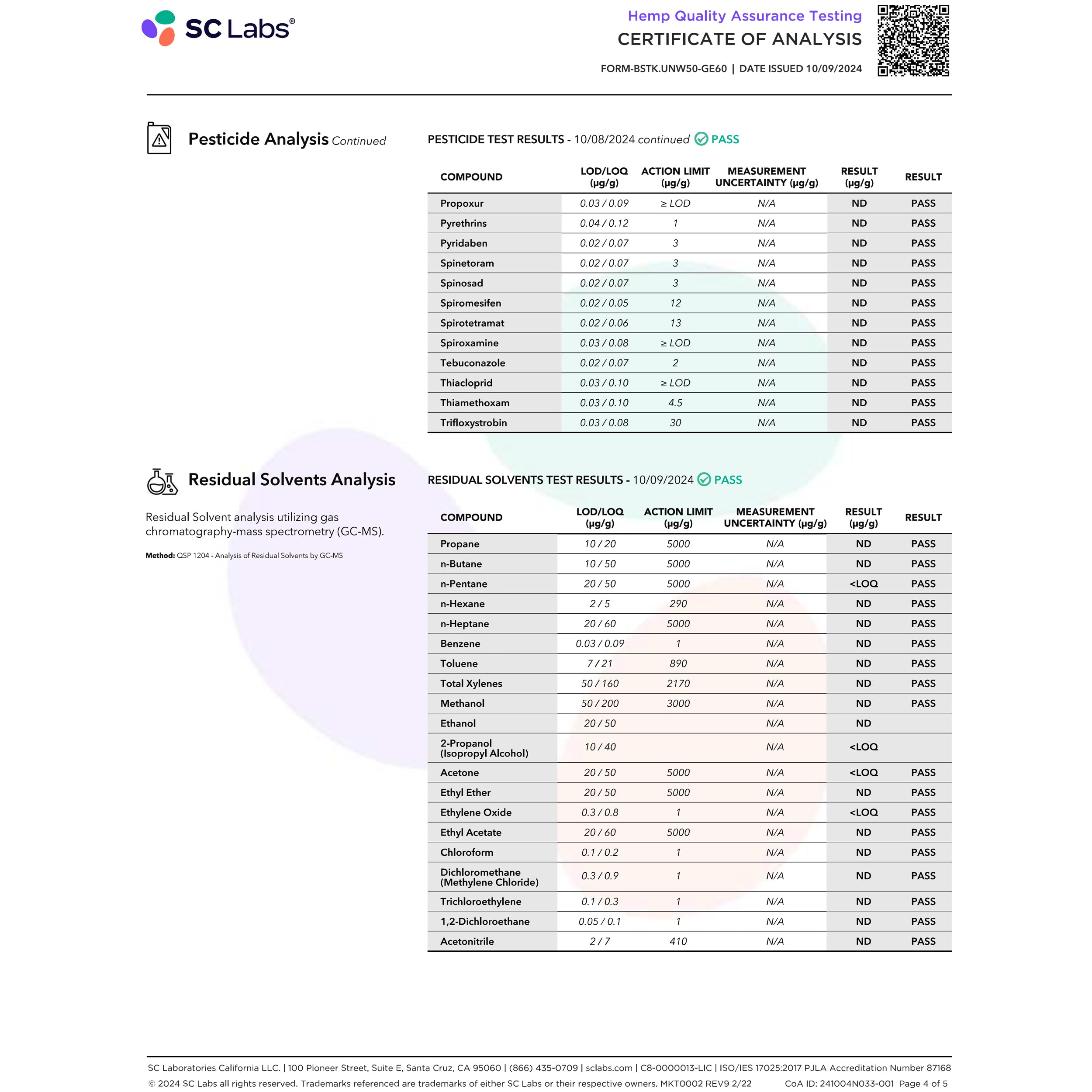 LabReport (#915) Delete Back to listing Edit Name Lab Report 5 Sample Name Not provided in the markdown content. Sample Matrix Not provided in the markdown content. Product Type cannabis Lab Name Not provided in the markdown content. Matching Name Lab Report 5 Not provided in the markdown content. Not provided in the markdown content. External Url https://purecbdnc.com/cdn/shop/files/LazarusRelaxandUnwindBalmStick_LavCOA5.jpg?v=1742237889 Internal Url https://cbdextract.nw.agency/lab-reports/LabReport5.jpg Category Null Type jpg Project pure cbd [ 104 ] State Processed Additional Data Extraction Date: 2024-10-08 Expiry Date: Delta-9 %: 0 THC-A %: 0 Total THC %: 0 D9/THC-A %: 0 Debug Data Null Markdown Content "# Pesticide Analysis\n\n**PESTICIDE TEST RESULTS - 10\/08\/2024 continued** \u2705 PASS\n\n| COMPOUND | LOD\/LOQ (\u00b5g\/g) | ACTION LIMIT (\u00b5g\/g) | MEASUREMENT UNCERTAINTY (\u00b5g\/g) | RESULT (\u00b5g\/g) | RESULT |\n|-----------------|----------------|---------------------|-------------------------------|--------------|--------|\n| Propoxur | 0.03 \/ 0.09 | \u2265 LOQ | N\/A | ND | PASS |\n| Pyrethrins | 0.04 \/ 0.12 | 1 | N\/A | ND | PASS |\n| Pyridaben | 0.02 \/ 0.07 | 3 | N\/A | ND | PASS |\n| Spinetoram | 0.02 \/ 0.07 | 3 | N\/A | ND | PASS |\n| Spinosad | 0.02 \/ 0.07 | 3 | N\/A | ND | PASS |\n| Spirodiclofen | 0.02 \/ 0.05 | 12 | N\/A | ND | PASS |\n| Spiromesifen | 0.02 \/ 0.06 | 13 | N\/A | ND | PASS |\n| Spirotetramat | 0.02 \/ 0.06 | 13 | N\/A | ND | PASS |\n| Spiroxamine | 0.03 \/ 0.08 | \u2265 LOQ | N\/A | ND | PASS |\n| Tebucanazole | 0.02 \/ 0.07 | 2 | N\/A | ND | PASS |\n| Thiacloprid | 0.03 \/ 0.10 | \u2265 LOQ | N\/A | ND | PASS |\n| Thiamethoxam | 0.03 \/ 0.10 | 4.5 | N\/A | ND | PASS |\n| Trifloxystrobin | 0.03 \/ 0.08 | 30 | N\/A | ND | PASS |\n\n# Residual Solvents Analysis\n\nResidual Solvent analysis utilizing gas chromatography-mass spectrometry (GC-MS).\n\n**Method:** QSM-1204 - Analysis of Residual Solvents by GC-MS\n\n**RESIDUAL SOLVENTS TEST RESULTS - 10\/09\/2024** \u2705 PASS\n\n| COMPOUND | LOD\/LOQ (\u00b5g\/g) | ACTION LIMIT (\u00b5g\/g) | MEASUREMENT UNCERTAINTY (\u00b5g\/g) | RESULT (\u00b5g\/g) | RESULT |\n|--------------------------------|----------------|---------------------|-------------------------------|--------------|--------|\n| Propane | 10 \/ 20 | 5000 | N\/A | ND | PASS |\n| n-Butane | 10 \/ 50 | 5000 | N\/A | ND | PASS |\n| n-Pentane | 20 \/ 50 | 5000 | N\/A | <LOQ | PASS |\n| n-Hexane | 2 \/ 5 | 290 | N\/A | ND | PASS |\n| n-Heptane | 20 \/ 60 | 5000 | N\/A | ND | PASS |\n| Benzene | 0.03 \/ 0.09 | 1 | N\/A | ND | PASS |\n| Toluene | 1 \/ 2 | 890 | N\/A | ND | PASS |\n| Total Xylenes | 50 \/ 160 | 2170 | N\/A | ND | PASS |\n| Methanol | 50 \/ 200 | 3000 | N\/A | ND | PASS |\n| Ethanol | 20 \/ 50 | | | | |\n| 2-Propanol (Isopropyl Alcohol) | 10 \/ 40 | | | <LOQ | |\n| Acetone | 20 \/ 50 | 5000 | N\/A | <LOQ | PASS |\n| Ethyl Ether | 20 \/ 50 | 5000 | N\/A | ND | PASS |\n| Ethylene Oxide | 0.3 \/ 0.8 | 1 | N\/A | ND | PASS |\n| Ethyl Acetate | 20 \/ 60 | 5000 | N\/A | ND | PASS |\n| Chloroform | 0.1 \/ 0.2 | 1 | N\/A | ND | PASS |\n| Dichloromethane (Methylene Chloride) | 0.3 \/ 0.9 | 1 | N\/A | ND | PASS |\n| Trichloroethylene | 0.1 \/ 0.3 | 1 | N\/A | ND | PASS |\n| 1,2-Dichloroethane | 0.05 \/ 0.1 | 1 | N\/A | ND | PASS |\n| Acetonitrile | 2 \/ 7 | 410 | N\/A | ND | PASS |\n" Do you really want to delete this item? There is no undo for this operation.