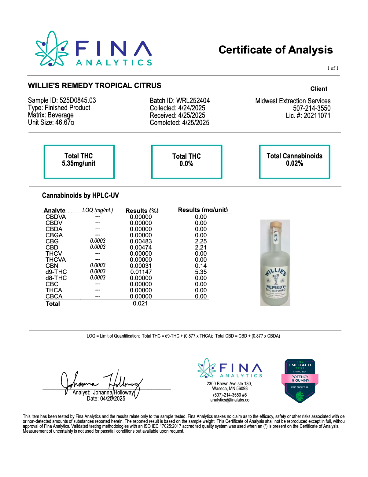 LabReport (#926) Delete Back to listing Edit Name 4.25.2025 Sample Name Null Sample Matrix Null Product Type Null Lab Name Null Matching Name 4.25.2025 External Url https://cdn.shopify.com/s/files/1/0857/8478/9239/files/5mg750ml4.25.png?v=1747524311 Internal Url https://cbdextract.nw.agency/lab-reports/4.25.2025.png Category 5mg - 750mL Bottle Type png Project Wille [ 112 ] State Processed Additional Data Extraction Date: Expiry Date: Delta-9 %: THC-A %: Total THC %: D9/THC-A %: Debug Data Null Markdown Content Null Do you really want to delete this item? There is no undo for this operation.