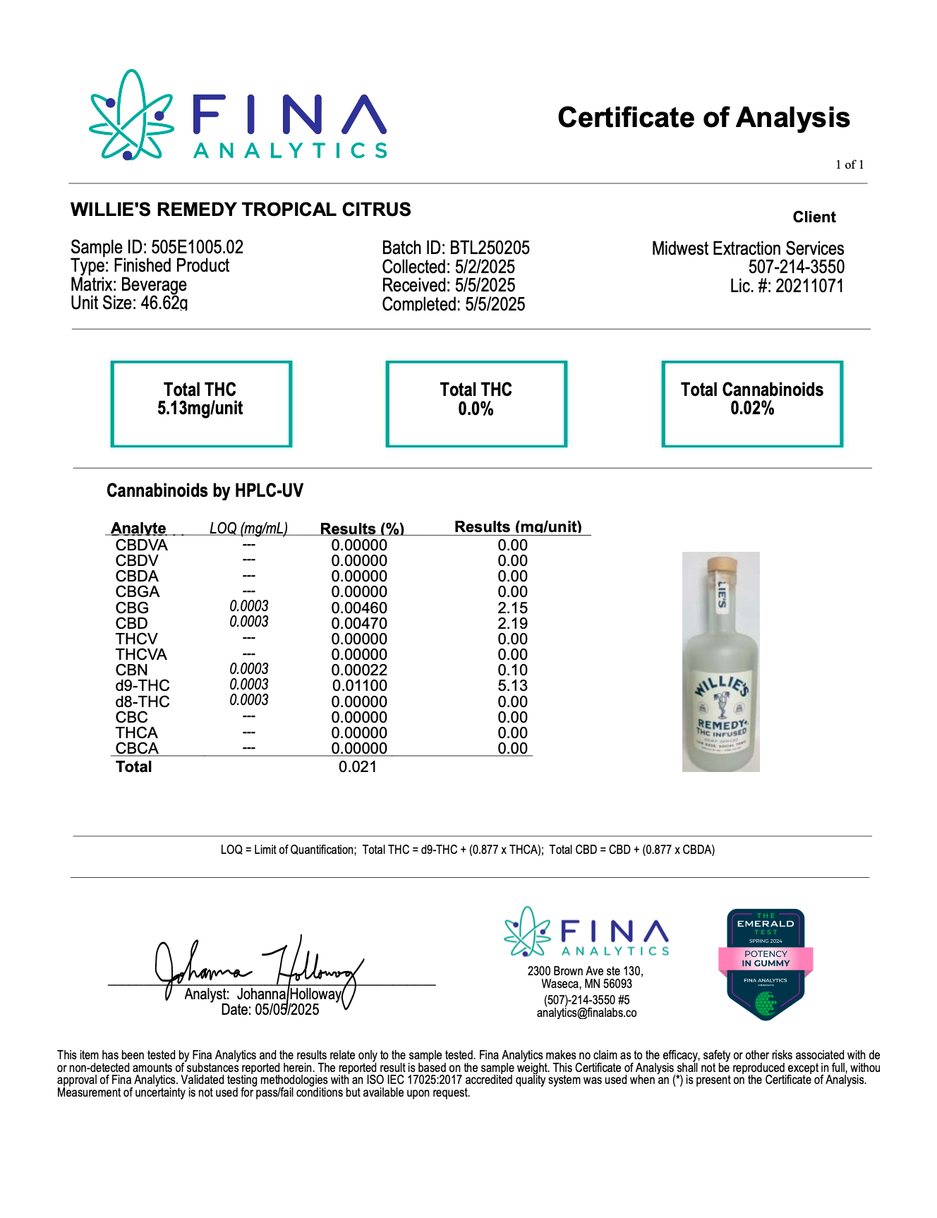 LabReport (#958) Delete Back to listing Edit Name 5.5.2025 (2) Sample Name WILLIE'S REMEDY TROPICAL CITRUS Sample Matrix Beverage Product Type cannabis Lab Name Fina Analytics Matching Name 5.5.2025 (2) WILLIE'S REMEDY TROPICAL CITRUS Beverage External Url https://cdn.shopify.com/s/files/1/0857/8478/9239/files/5mg750ml5.5.2.png?v=1747524311 Internal Url https://cbdextract.nw.agency/lab-reports/5.5.2025(2).png Category 5mg - 750mL Bottle Type png Project Willies - kelby [ 115 ] State Processed Additional Data Extraction Date: 2025-05-02 Expiry Date: Delta-9 %: 1.1 THC-A %: 0 Total THC %: 1.1 D9/THC-A %: 1.1 Debug Data [{"message":"Decrypted lab report file is corrupted","code":"corrupted_lab_report_file","otherData":{"internalLabReportUrl":"https:\/\/cbdextract.nw.agency\/lab-reports\/5.5.2025(2).png","externalLabReportUrl":"https:\/\/cdn.shopify.com\/s\/files\/1\/0857\/8478\/9239\/files\/5mg750ml5.5.2.png?v=1747524311"}}] Markdown Content "\nCertificate of Analysis \n1 of 1\n\n\n# WILLIE'S REMEDY TROPICAL CITRUS\n\n**Sample ID:** 505E1005.02 \n**Type:** Finished Product \n**Matrix:** Beverage \n**Unit Size:** 46.62g \n\n**Batch ID:** BTL250205 \n**Collected:** 5\/2\/2025 \n**Received:** 5\/5\/2025 \n**Completed:** 5\/5\/2025 \n\n**Client** \nMidwest Extraction Services \n507-214-3550 \nLic. #: 20211071 \n\n| Total THC | Total THC | Total Cannabinoids |\n|-----------|-----------|--------------------|\n| 5.13mg\/unit | 0.0% | 0.02% |\n\n## Cannabinoids by HPLC-UV\n\n| Analyte | LOQ (mg\/mL) | Results (%) | Results (mg\/unit) |\n| ------- | ----------- | ----------- | ----------------- |\n| CBDVA | --- | 0.00000 | 0.00 |\n| CBDV | --- | 0.00000 | 0.00 |\n| CBDA | --- | 0.00000 | 0.00 |\n| CBGA | --- | 0.00000 | 0.00 |\n| CBG | 0.0003 | 0.00460 | 2.15 |\n| CBD | 0.0003 | 0.00470 | 2.19 |\n| THCV | --- | 0.00000 | 0.00 |\n| THCVA | --- | 0.00000 | 0.00 |\n| CBN | 0.0003 | 0.00022 | 0.10 |\n| d9-THC | 0.0003 | 0.01100 | 5.13 |\n| d8-THC | 0.0003 | 0.00000 | 0.00 |\n| CBC | --- | 0.00000 | 0.00 |\n| THCA | --- | 0.00000 | 0.00 |\n| CBCA | --- | 0.00000 | 0.00 |\n| Total | | | 0.021 |\n\n\nLOQ = Limit of Quantification; Total THC = d9-THC + (0.877 x THCA); Total CBD = CBD + (0.877 x CBDA)\n\n----\n\n**Analyst:** Johanna Holloway \n**Date:** 05\/05\/2025 \n\nFina Analytics \n2300 Brown Ave ste 130, \nWaseca, MN 56093 \n(507)-214-3550 #5 \nanalytics@finaalabs.co \n\nThis item has been tested by Fina Analytics and the results relate only to the sample tested. Fina Analytics makes no claim as to the efficacy, safety or other risks associated with detected or non-detected amounts of substances reported herein. The reported result is based on the sample weight. This Certificate of Analysis shall not be reproduced except in full, without approval of Fina Analytics. Validated testing methodologies with an ISO IEC 17025:2017 accredited quality system was used when an (*) is present on the Certificate of Analysis. Measurement of uncertainty is not used for pass\/fail conditions but available upon request." Do you really want to delete this item? There is no undo for this operation.