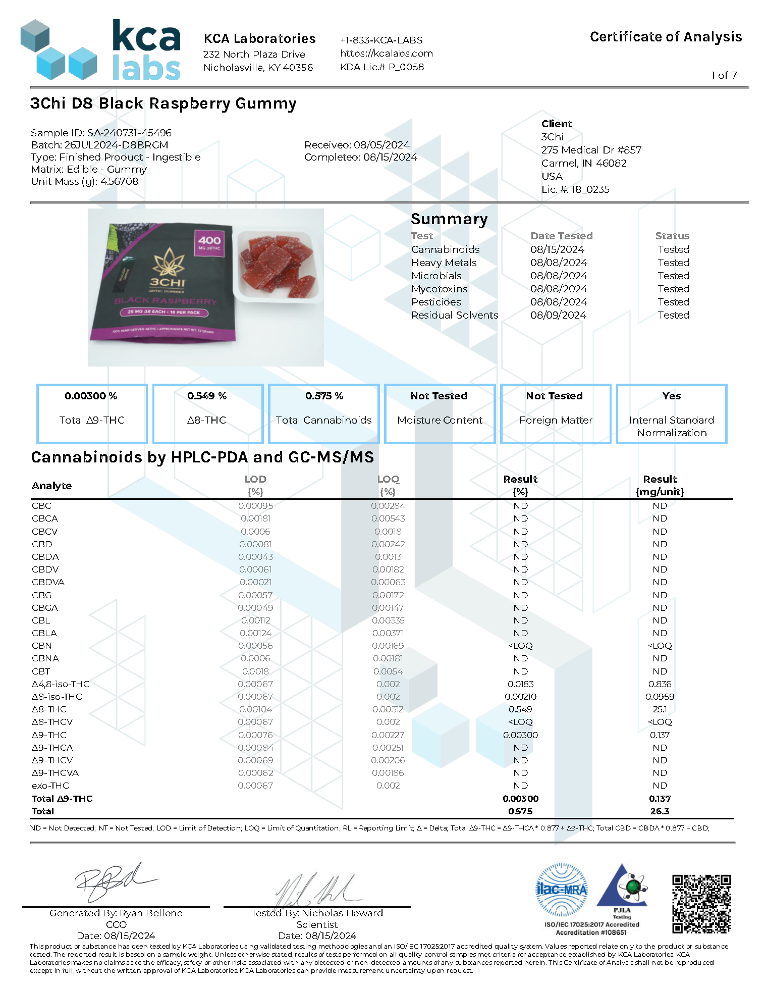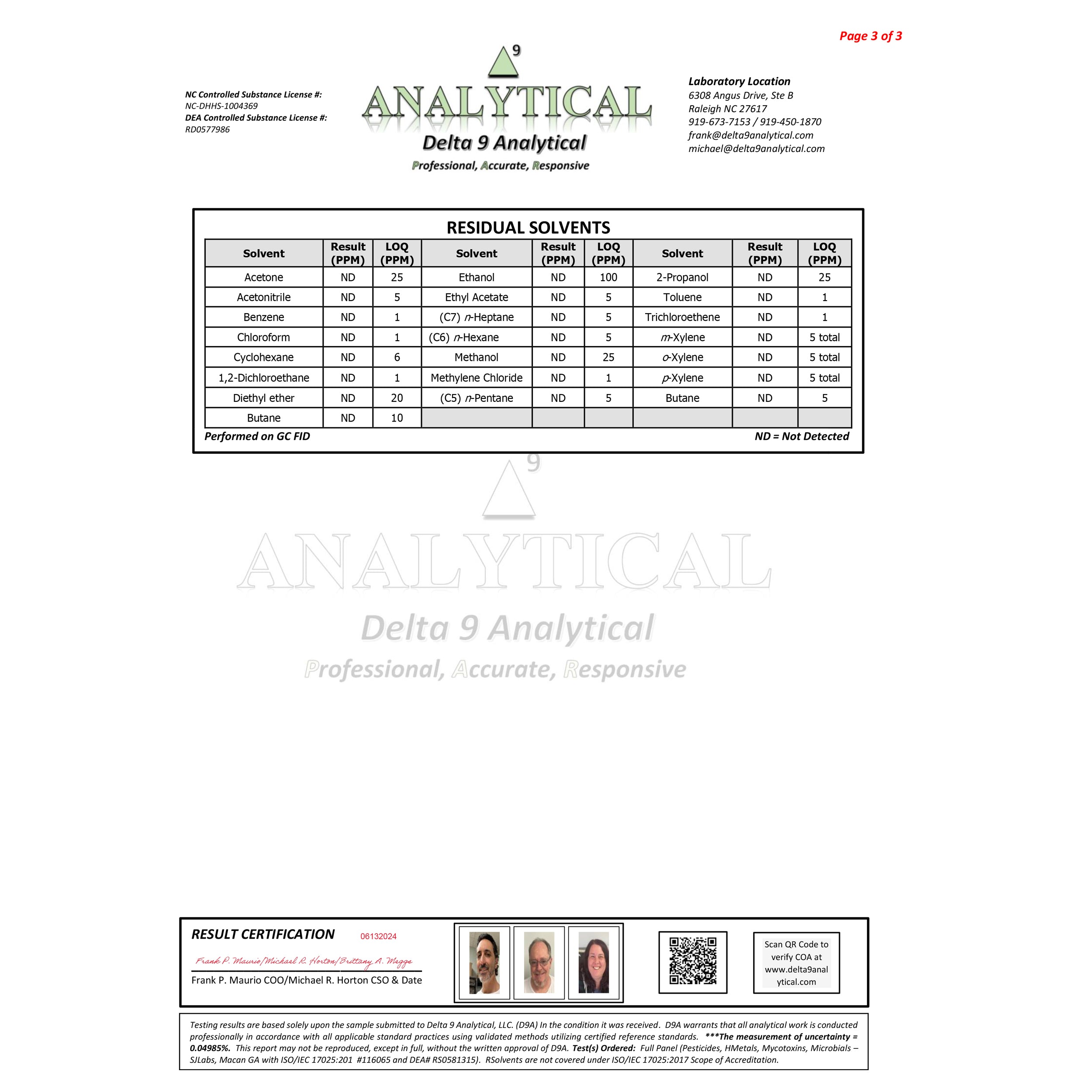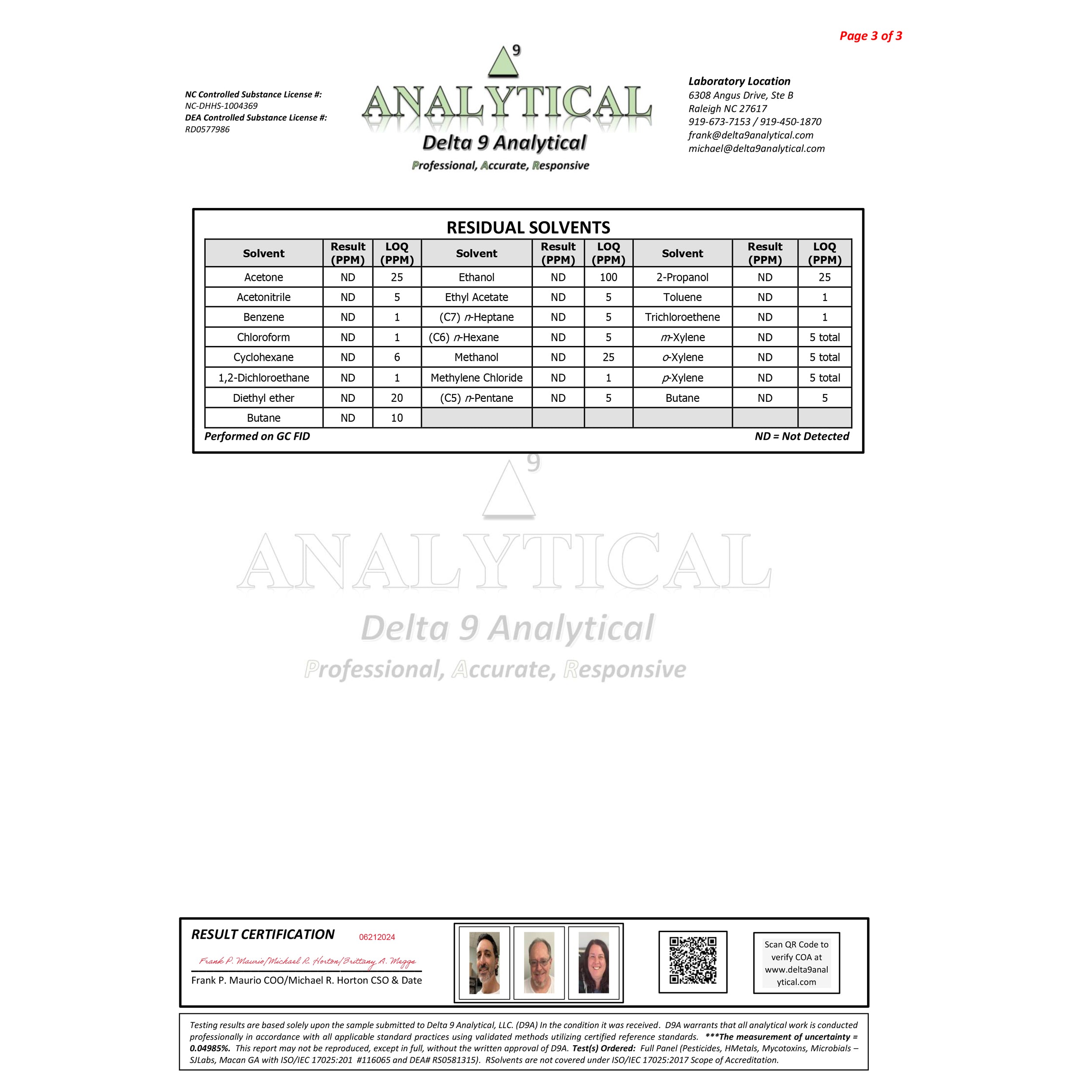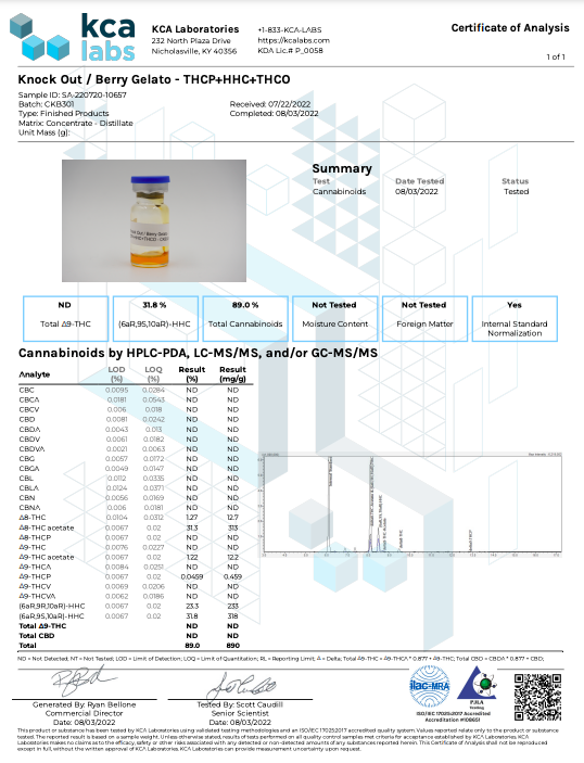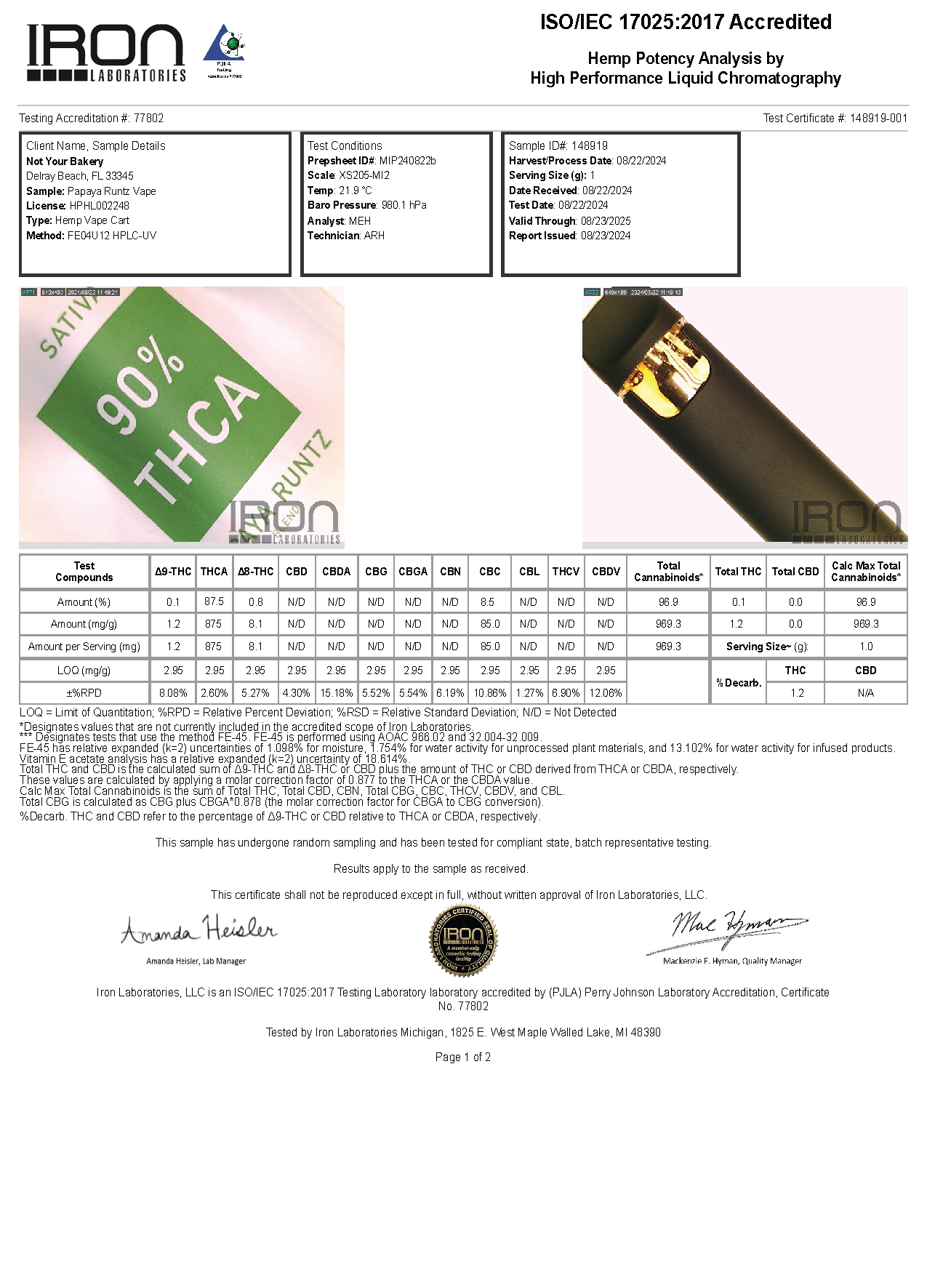 "\nISO\/IEC 17025:2017 Accredited \nHemp Potency Analysis by High Performance Liquid Chromatography \nTest Certificate #: 148191-001\n\n# Testing Accreditation #: 77802\n\n| Client Name, Sample Details | Test Conditions | Sample ID#: 148191 |\n|-----------------------------|-----------------|--------------------|\n| Not Your Bakery | Prep\/Sheet ID#: MIP240822b | Harvest\/Process Date: 08\/22\/2024 |\n| Delray Beach, FL 33445 | Scale: XS205-M12 | Serving Size (g): 1 |\n| Sample: Papaya Runtz Vape | Temp: 21.9 \u00b0C | Date Received: 08\/22\/2024 |\n| License: MI-HOU2248 | Baro Pressure: 980.1 hPa | Test Date: 08\/22\/2024 |\n| Type: Hemp Vape Cart | Analyst: MEH | Valid Through: 08\/23\/2025 |\n| Method: FE04U12 HPLC-UV | Technician: ARH | Report Issued: 08\/23\/2024 |\n\n| Test Compounds | \u03949-THC | THCA | \u03948-THC | CBD | CBDA | CBC | CBGA | CBN | CBC | CBL | THCV | CBDV | Total Cannabinoids | Total THC | Total CBD | Calc Max Total Cannabinoids |\n|----------------|--------|------|--------|-----|------|-----|------|-----|-----|-----|------|------|--------------------|-----------|----------|-----------------------------|\n| Amount (%) | 0.1 | 87.5 | 0.8 | N\/D | N\/D | N\/D | N\/D | N\/D | N\/D | N\/D | N\/D | N\/D | 89.3 | 0.9 | N\/D | 89.3 |\n| Amount (mg\/g) | 1.2 | 875 | 8.1 | N\/D | N\/D | N\/D | N\/D | N\/D | N\/D | N\/D | N\/D | N\/D | 893 | 9.0 | N\/D | 893 |\n| Amount per Serving (mg) | 1.2 | 875 | 8.1 | N\/D | N\/D | N\/D | N\/D | N\/D | N\/D | N\/D | N\/D | N\/D | 893 | 9.0 | N\/D | 893 |\n| LOQ (mg\/g) | - | - | - | - | - | - | 2.95 | - | - | - | 2.95 | 2.95 | 2.95 | - | - | - |\n\n- LOD = Limit of Quantitation; %RPD = Relative Percent Deviation; %RSD = Relative Standard Deviation; N\/D = Not Detected\n- *Designates values that are not currently included in the accredited scope of Iron Laboratories\n- FE-45 designates tests that use the method FE-45. FE-45 is performed using AOAC 968.07 and 32.004-32.009\n- FE-45 has a relative expanded (k=2) uncertainty of \u00b110% for moisture, \u00b11.4% for water activity for unprocessed plant materials, and 13.10% for water activity for infused products. Vitamin E acetate analysis has a relative expanded (k=2) uncertainty of \u00b18.8%\n- Total THC and CBD is calculated using the formula: THC = (0.877 * THCA) + \u03949-THC. This is the amount of THC or CBD derived from THCA or CBDA, respectively.\n- These values are calculated by applying a molar correction factor of 0.877 to the THCA or the CBDA value\n- Calc Max Total Cannabinoids is the sum of Total THC, Total CBD, CBN, Total CBG, CBC, THCV, CBDV, and CBL.\n- Total CBG is calculated as CBG plus CBGA * 0.878 (the molar correction factor for CBGA to CBG conversion).\n- %Decarb. THC and CBD refer to the percentage of \u03949-THC or CBD relative to THCA or CBDA, respectively.\n\n**This sample has undergone random sampling and has been tested for compliant state, batch representative testing.**\n\nResults apply to the sample as received.\n\nThis certificate shall not be reproduced except in full, without written approval of Iron Laboratories, LLC.\n\n----\n\nAmanda Heidler \nAmanda Heidler, Lab Manager\n\nMac Hyman \nMacKenzie L. Hyman, Quality Manager\n\nIron Laboratories, LLC is an ISO\/IEC 17025:2017 Testing Laboratory laboratory accredited by (PJLA) Perry Johnson Laboratory Accreditation, Certificate No. 77802\n\nTested by Iron Laboratories Michigan, 1825 E. West Maple Walled Lake, MI 48390\n\nPage 1 of 2"