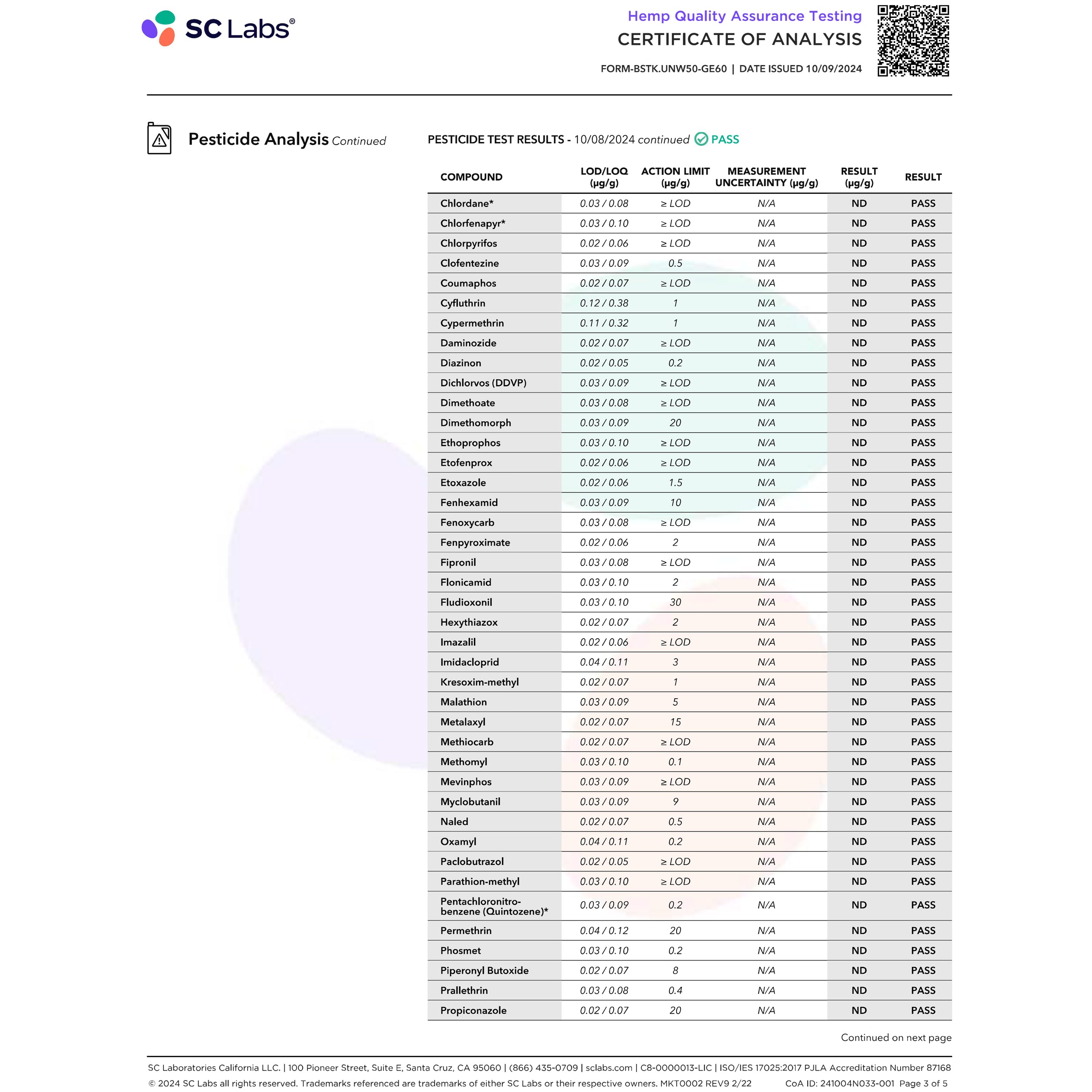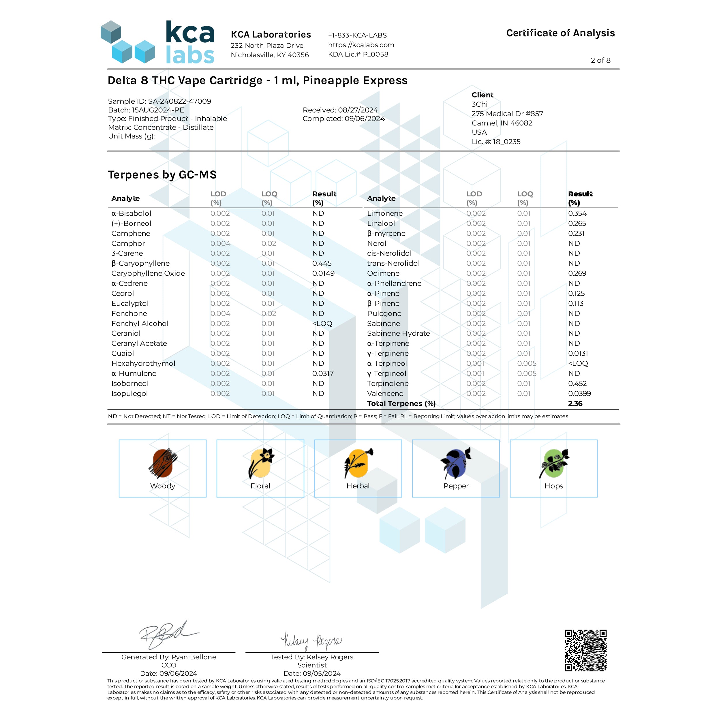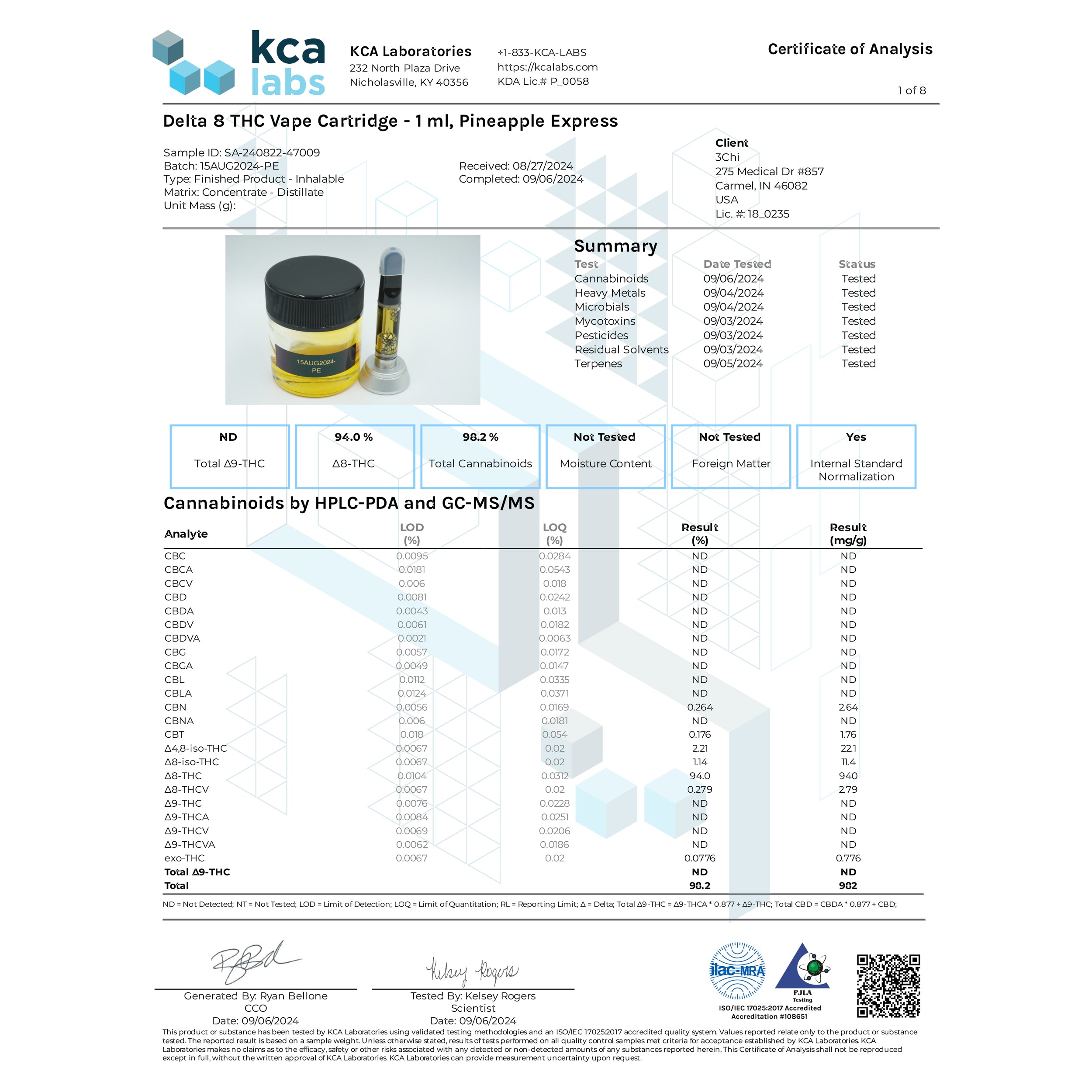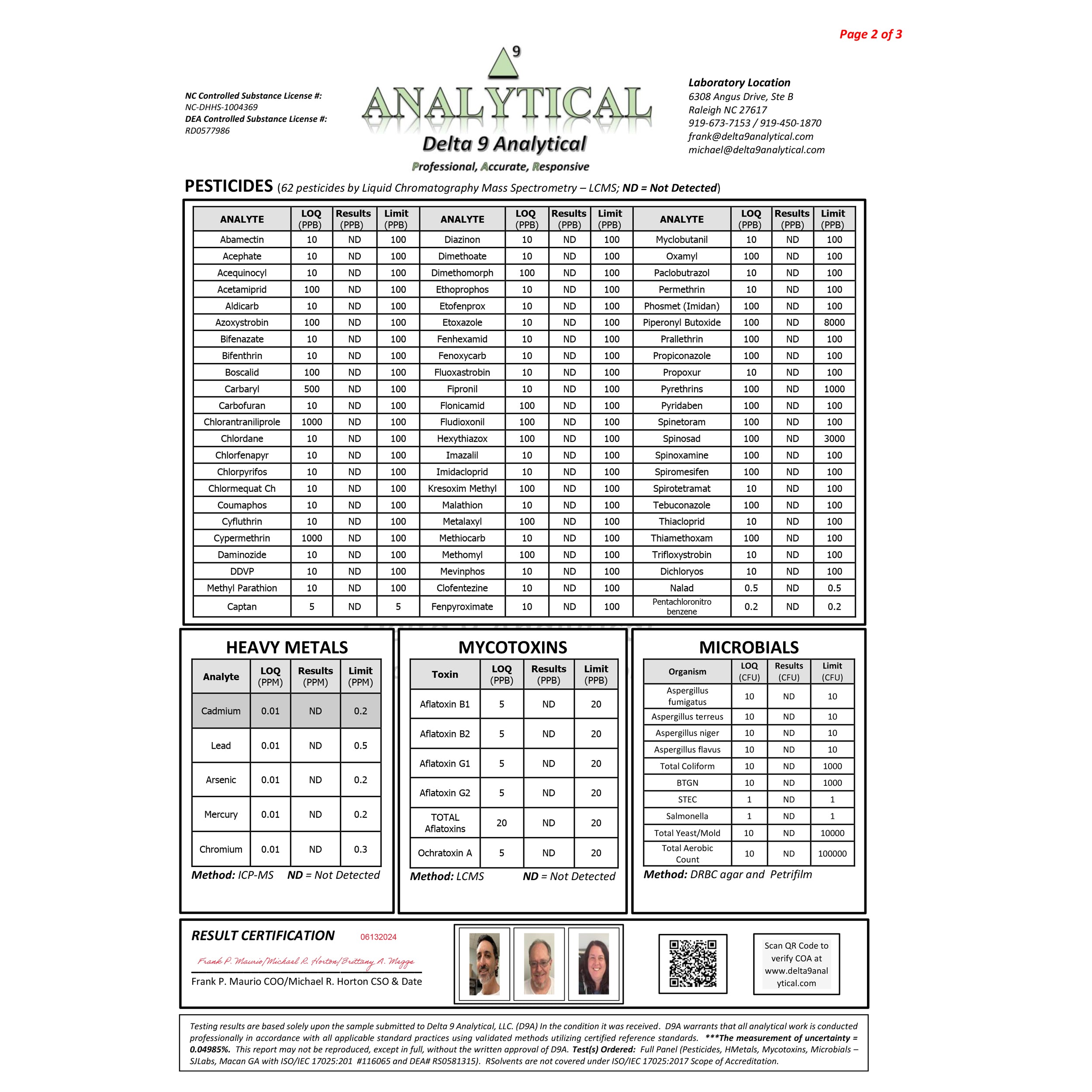 "\nISO\/IEC 17025:2017 Accredited \nHemp Potency Analysis by High Performance Liquid Chromatography \nTest Certificate #: 148191-001\n\n# Testing Accreditation #: 77802\n\n| Client Name, Sample Details | Test Conditions | Sample ID#: 148191 |\n|-----------------------------|-----------------|--------------------|\n| Not Your Bakery | Prep\/Sheet ID#: MIP240822b | Harvest\/Process Date: 08\/22\/2024 |\n| Delray Beach, FL 33445 | Scale: XS205-M12 | Serving Size (g): 1 |\n| Sample: Papaya Runtz Vape | Temp: 21.9 \u00b0C | Date Received: 08\/22\/2024 |\n| License: MI-HOU2248 | Baro Pressure: 980.1 hPa | Test Date: 08\/22\/2024 |\n| Type: Hemp Vape Cart | Analyst: MEH | Valid Through: 08\/23\/2025 |\n| Method: FE04U12 HPLC-UV | Technician: ARH | Report Issued: 08\/23\/2024 |\n\n| Test Compounds | \u03949-THC | THCA | \u03948-THC | CBD | CBDA | CBC | CBGA | CBN | CBC | CBL | THCV | CBDV | Total Cannabinoids | Total THC | Total CBD | Calc Max Total Cannabinoids |\n|----------------|--------|------|--------|-----|------|-----|------|-----|-----|-----|------|------|--------------------|-----------|----------|-----------------------------|\n| Amount (%) | 0.1 | 87.5 | 0.8 | N\/D | N\/D | N\/D | N\/D | N\/D | N\/D | N\/D | N\/D | N\/D | 89.3 | 0.9 | N\/D | 89.3 |\n| Amount (mg\/g) | 1.2 | 875 | 8.1 | N\/D | N\/D | N\/D | N\/D | N\/D | N\/D | N\/D | N\/D | N\/D | 893 | 9.0 | N\/D | 893 |\n| Amount per Serving (mg) | 1.2 | 875 | 8.1 | N\/D | N\/D | N\/D | N\/D | N\/D | N\/D | N\/D | N\/D | N\/D | 893 | 9.0 | N\/D | 893 |\n| LOQ (mg\/g) | - | - | - | - | - | - | 2.95 | - | - | - | 2.95 | 2.95 | 2.95 | - | - | - |\n\n- LOD = Limit of Quantitation; %RPD = Relative Percent Deviation; %RSD = Relative Standard Deviation; N\/D = Not Detected\n- *Designates values that are not currently included in the accredited scope of Iron Laboratories\n- FE-45 designates tests that use the method FE-45. FE-45 is performed using AOAC 968.07 and 32.004-32.009\n- FE-45 has a relative expanded (k=2) uncertainty of \u00b110% for moisture, \u00b11.4% for water activity for unprocessed plant materials, and 13.10% for water activity for infused products. Vitamin E acetate analysis has a relative expanded (k=2) uncertainty of \u00b18.8%\n- Total THC and CBD is calculated using the formula: THC = (0.877 * THCA) + \u03949-THC. This is the amount of THC or CBD derived from THCA or CBDA, respectively.\n- These values are calculated by applying a molar correction factor of 0.877 to the THCA or the CBDA value\n- Calc Max Total Cannabinoids is the sum of Total THC, Total CBD, CBN, Total CBG, CBC, THCV, CBDV, and CBL.\n- Total CBG is calculated as CBG plus CBGA * 0.878 (the molar correction factor for CBGA to CBG conversion).\n- %Decarb. THC and CBD refer to the percentage of \u03949-THC or CBD relative to THCA or CBDA, respectively.\n\n**This sample has undergone random sampling and has been tested for compliant state, batch representative testing.**\n\nResults apply to the sample as received.\n\nThis certificate shall not be reproduced except in full, without written approval of Iron Laboratories, LLC.\n\n----\n\nAmanda Heidler \nAmanda Heidler, Lab Manager\n\nMac Hyman \nMacKenzie L. Hyman, Quality Manager\n\nIron Laboratories, LLC is an ISO\/IEC 17025:2017 Testing Laboratory laboratory accredited by (PJLA) Perry Johnson Laboratory Accreditation, Certificate No. 77802\n\nTested by Iron Laboratories Michigan, 1825 E. West Maple Walled Lake, MI 48390\n\nPage 1 of 2"