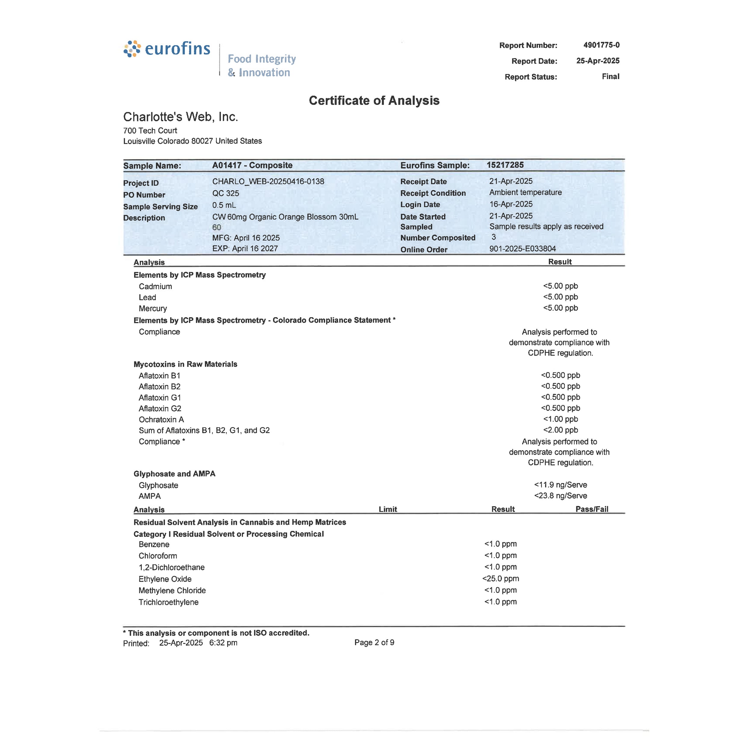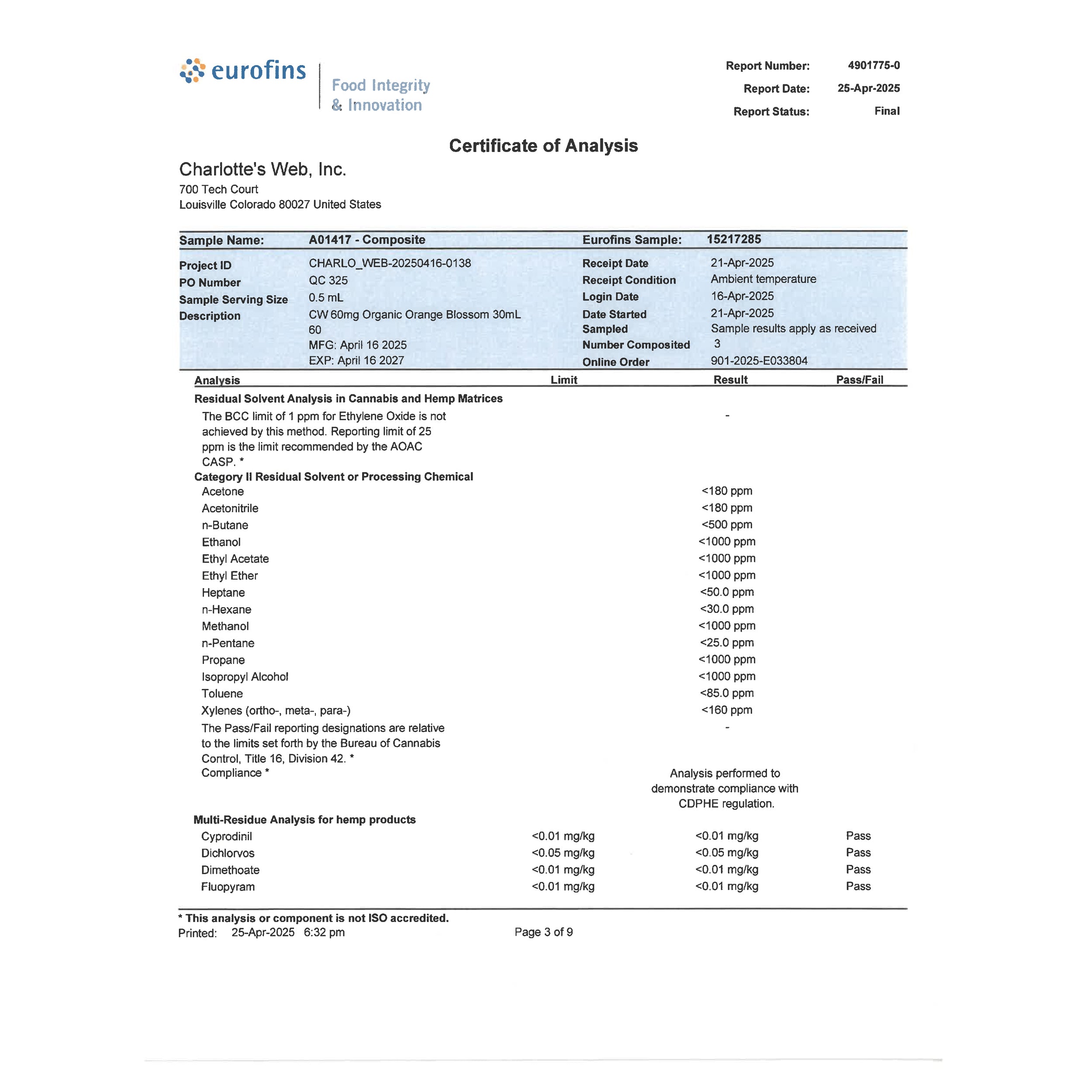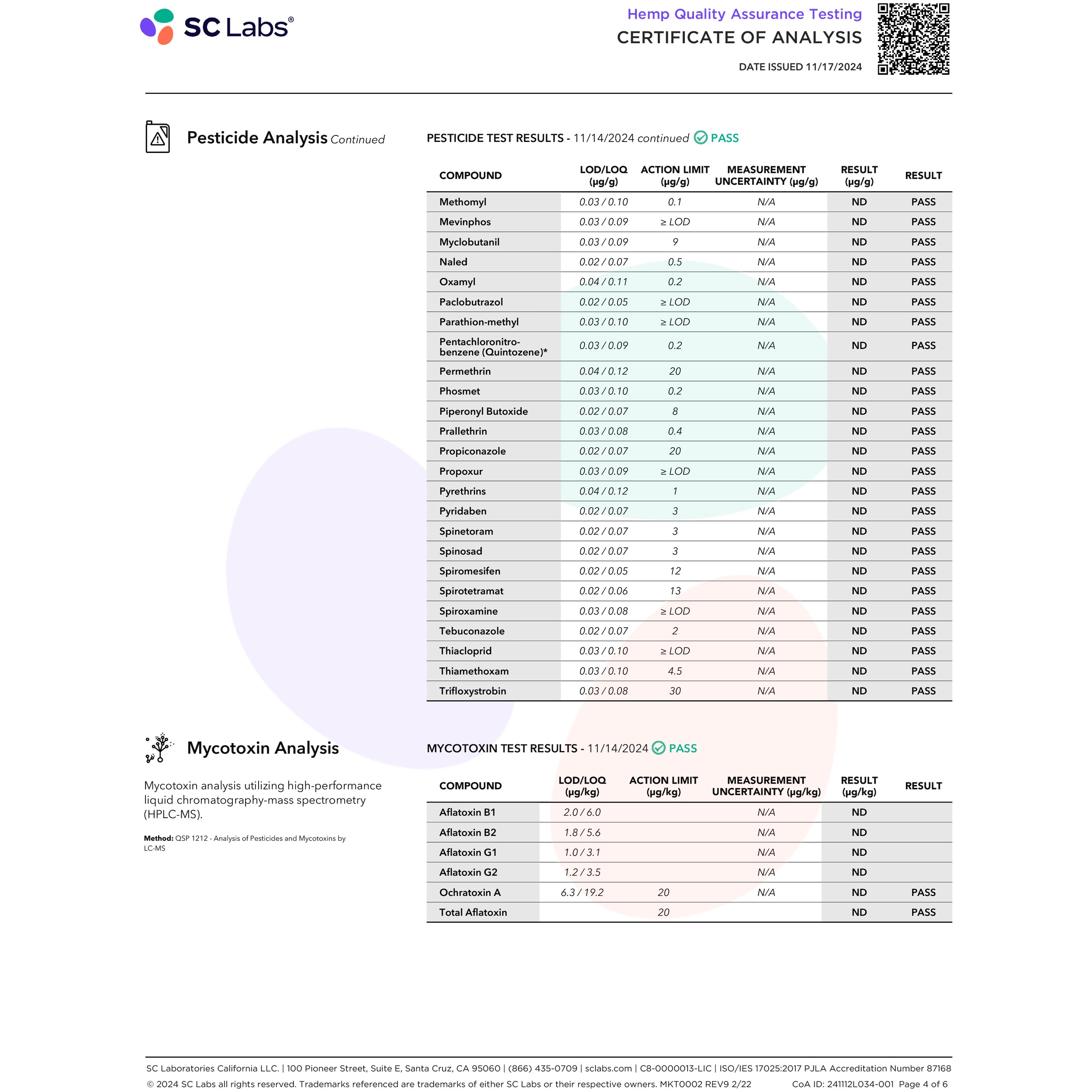 "\nCustomer: EA Sample ID: 24EA02229-008 \nCBDfx \nSample Name: Vape Pen - Watermelon - CBD\/THC \nSample Type: Liquid \nBatch\/Lot: WS2442 \nReference #: \nDate Received: 03\/29\/2024 \nDate Completed: 04\/08\/2024 \n\n# CERTIFICATE OF ANALYSIS\n\n## Summary of Results\n\n| Analysis Type | SOP | Date Tested | Status |\n| ----------------- | -------------- | ----------- | -------- |\n| Cannabinoids | EA-SOP-POTENCY | 03\/30\/2024 | Complete |\n| Heavy Metals | EA-SOP-HM | 04\/04\/2024 | Pass |\n| Microbials | EA-SOP-ARIA | 04\/06\/2024 | Pass |\n| Mycotoxins | EA-SOP-MYCO | 04\/08\/2024 | Pass |\n| Residual Solvents | EA-SOP-RES | 04\/06\/2024 | Pass |\n| Pesticides | EA-SOP-PEST | 04\/08\/2024 | Pass |\n\n\nUnit Size (g): 5.5\n\n## POTENCY CANNABINOID PROFILE\n\n| Total THC | Total CBD |\n| ---------------------- | ------------------- |\n| THCA \\* 0.877 + D9-THC | CBDA \\* 0.877 + CBD |\n| 10.07 mg\/unit | 1538.84 mg\/unit |\n\n\n| Analyte | Result (mg\/g) | mg\/unit | w\/w % | LOQ (ppm) | LOD (ppm) |\n| ------------------------------------- | ------------- | ------- | ----- | --------- | --------- |\n| CANNABIDIVARIN (CBDV) | 1.13 | 6.19 | 0.11 | 100 | 30 |\n| CANNABICHROMENE (CBC) | ND | ND | ND | 100 | 30 |\n| CANNABIGEROL (CBG) | ND | ND | ND | 100 | 30 |\n| CANNABINOL (CBN) | ND | ND | ND | 100 | 30 |\n| CANNABIDIOL (CBD) | 279.79 | 1538.84 | 27.98 | 100 | 30 |\n| CANNABIDIOLIC ACID (CBDA) | ND | ND | ND | 100 | 30 |\n| \u03949-TETRAHYDROCANNABINOLIC ACID (THCA) | ND | ND | ND | 100 | 30 |\n| \u03949-TETRAHYDROCANNABINOL (D9-THC) | 1.83 | 10.07 | 0.18 | 100 | 30 |\n| \u03948-TETRAHYDROCANNABINOL (D8-THC) | ND | ND | ND | 100 | 30 |\n\n\n**NOTES:**\n\nND = NOT DETECTED; LOD = LIMIT OF DETECTION; LOQ = LIMIT OF QUANTIFICATION \nThe cannabinoid potency reported above was analyzed via High Performance Liquid Chromatography (HPLC) using Variable Wavelength Detection (VWD).\n\n----\n\nEthos Analytics Laboratory \n3020 E Camelback Rd STE 397 \nPhoenix, AZ 85016 \ninfo@ethosanalytics.io \nwww.ethosanalytics.io \nLicense #: 0000002KANCOD176649 \nISO\/IEC 17025 Acc #: 117798 \n\nNoel Samsum \nLaboratory Director \n8-Apr-2024\n\nThe sample analyzed was inspected and is free from visual mold, mildew, and foreign matter. The testing procedures, equipment calibration, and maintenance are all in accordance with ISO\/IEC 17025:2017 standards. The presented report is only applicable to the sample specified above and may not be applied to any similar or identical products. Reports are prohibited from being reproduced with alterations of any kind.\n---\n\nCustomer: CBDFx \nEA Sample ID: 24EA0229-008 \nSample Name: Vape Pen - Watermelon - CBD\/THC \nSample Type: Liquid \nBatch\/Lot: WS2442 \nReference #: \n\nDate Received: 03\/29\/2024 \nDate Completed: 04\/08\/2024 \n\n# CERTIFICATE OF ANALYSIS\n\n## Heavy Metal Analysis\n\n| Analyte | Result (ppm) | LOQ (ppm) | LOD (ppm) | Limit (ppm) | Pass\/Fail |\n| ------- | ------------ | --------- | --------- | ----------- | --------- |\n| Arsenic | \\<LOD | 0.010 | 0.005 | 1.5 | Pass |\n| Cadmium | \\<LOD | 0.010 | 0.005 | 0.5 | Pass |\n| Lead | \\<LOD | 0.010 | 0.005 | 0.5 | Pass |\n| Mercury | \\<LOD | 0.010 | 0.005 | 3.0 | Pass |\n\n\n## Microbiological Analysis\n\n| Microbe | Result | Limit | Pass\/Fail |\n| -------------------------- | ------------ | ----------- | --------- |\n| Aspergillus Flavus | Negative\/1g | Negative\/1g | Pass |\n| Aspergillus Fumigatus | Negative\/1g | Negative\/1g | Pass |\n| Aspergillus Niger | Negative\/1g | Negative\/1g | Pass |\n| Aspergillus Terreus | Negative\/1g | Negative\/1g | Pass |\n| Escherichia Coli (E. Coli) | Negative\/1g | Negative\/1g | Pass |\n| Salmonella | Negative\/1g | Negative\/1g | Pass |\n| Yeast\/Mold | Not Detected | - | Pass |\n\n\n**NOTES:** \nCFU = Colony Forming Unit \nNS = Not Specified \nNT = Not Tested \n\nLOQ = Limit of Quantification \nLOD = Limit of Detection \n\nEthos Analytics Laboratory \n3020 E Camelback Rd Ste 397 \nPhoenix, AZ 85016 \ninfo@ethosanalytics.io \nwww.ethosanalytics.io \nLic # C10-0000260-LIC#CDPH-10004649 \nISO\/IEC 17025 Acc. # 117788 \n\nNoel Samsum \nLaboratory Director \n8-Apr-2024 \n\nThe sample analyzed was inspected and is free from visual mold, mildew, and foreign matter. The testing procedures, equipment calibration, and maintenance are all in accordance with ISO\/IEC 17025:2017 standards. The presented report is only applicable to the sample specified above and may not be applied to any similar or identical products. Reports are prohibited from being reproduced with alterations of any kind.\n\n---\n\nCustomer: CBDFx \nEA Sample ID: 24EA0229-008 \nSample Name: Vape Pen - Watermelon - CBD\/THC \nSample Type: Liquid \nBatch\/Lot: WS2442 \nReference #: \n\nDate Received: 03\/29\/2024 \nDate Completed: 04\/08\/2024 \n\n# CERTIFICATE OF ANALYSIS\n\n## Mycotoxins\n\n| Analyte | Result (ppb) | LOD (ppb) | LOQ (ppb) | Limit (ppb) | Pass\/Fail |\n|---------------|--------------|-----------|-----------|-------------|-----------|\n| Aflatoxin B1 | <LOD | 3.0 | 9.0 | - | - |\n| Aflatoxin B2 | <LOD | 2.0 | 9.0 | - | - |\n| Aflatoxin G1 | <LOD | 3.0 | 9.0 | - | - |\n| Aflatoxin G2 | <LOD | 2.0 | 6.0 | - | - |\n| Ochratoxin A | <LOD | 4.0 | 12.0 | 20 | Pass |\n| Total Aflatoxins | <LOD | | | 20 | Pass |\n\n## Residual Solvent Analysis\n\n| Analyte | Result (ppm) | LOD (ppm) | LOQ (ppm) | Limit (ppm) | Pass\/Fail |\n|--------------------|--------------|-----------|-----------|-------------|-----------|\n| 1,2-Dichloro-Ethane| <LOD | 0.10 | 0.30 | 1 | Pass |\n| Benzene | <LOD | 0.03 | 0.10 | 1 | Pass |\n| Chloroform | <LOD | 0.03 | 0.10 | 1 | Pass |\n| Ethylene Oxide | <LOD | 0.20 | 0.60 | 1 | Pass |\n| Methylene-Chloride | <LOD | 0.10 | 0.80 | 1 | Pass |\n| Trichloroethene | <LOD | 0.03 | 0.20 | 1 | Pass |\n| Acetone | <LOD | 1 | 60 | 5000 | Pass |\n| Acetonitrile | <LOD | 1 | 5 | 410 | Pass |\n| Butane | <LOD | 1 | 5 | 5000 | Pass |\n| Ethanol | <LOD | 3 | 10 | 5000 | Pass |\n| 