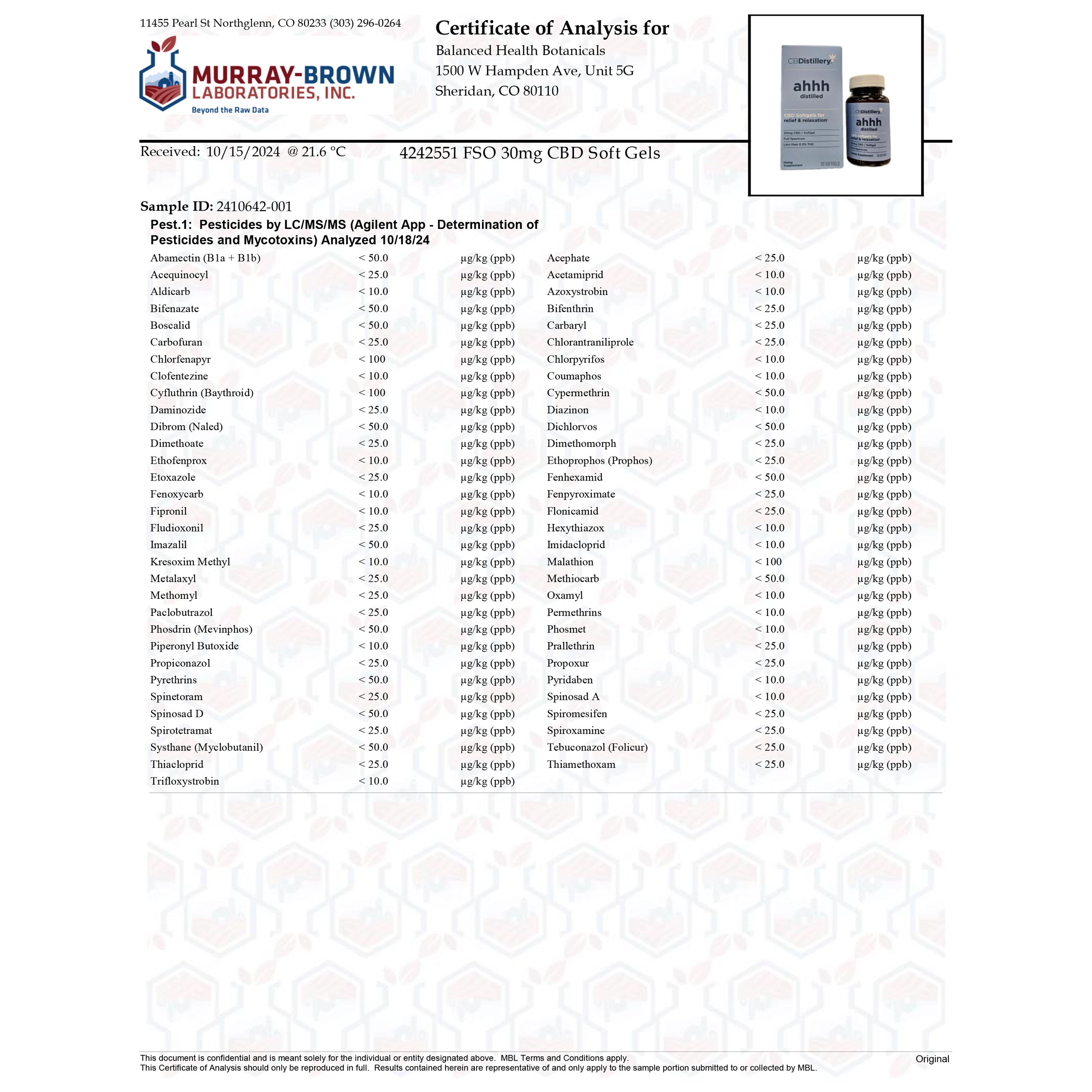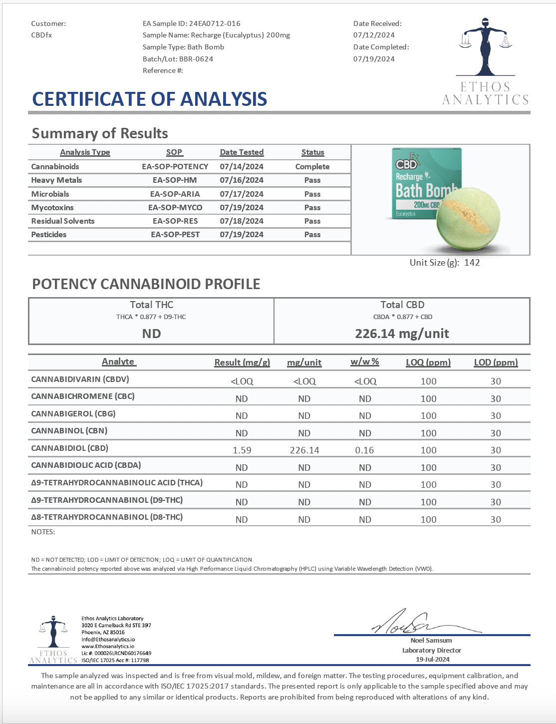 "\nCustomer: EA Sample ID: 24EA0927-012 \nCBDfx \nSample Name: Vape Pen - Blue Rasberry 1500mg \nSample Type: Liquid \nBatch\/Lot: BB2637 \nReference #: \nDate Received: 09\/27\/2024 \nDate Completed: 10\/02\/2024 \n\n# CERTIFICATE OF ANALYSIS\n\n## Summary of Results\n\n| Analysis Type | SOP | Date Tested | Status |\n| ----------------- | -------------- | ----------- | -------- |\n| Cannabinoids | EA-SOP-POTENCY | 09\/28\/2024 | Complete |\n| Heavy Metals | EA-SOP-HM | 09\/28\/2024 | Pass |\n| Microbials | EA-SOP-ARIA | 09\/30\/2024 | Pass |\n| Mycotoxins | EA-SOP-MYCO | 10\/02\/2024 | Pass |\n| Residual Solvents | EA-SOP-RES | 09\/30\/2024 | Pass |\n| Pesticides | EA-SOP-PEST | 10\/02\/2024 | Pass |\n\n\nUnit Size (g): 5.5\n\n## POTENCY CANNABINOID PROFILE\n\n| Total THC | Total CBD |\n|-----------|-----------|\n| THCA * 0.877 + D9-THC | CBDA * 0.877 + CBD |\n| ND | 1561.02 mg\/unit |\n\n| Analyte | Result (mg\/g) | mg\/unit | w\/w % | LOQ (ppm) | LOD (ppm) |\n| ------------------------------------- | ------------- | ------- | ----- | --------- | --------- |\n| CANNABIDIVARIN (CBDV) | 1.29 | 7.11 | 0.13 | 100 | 30 |\n| CANNABICHROMENE (CBC) | ND | ND | ND | 100 | 30 |\n| CANNABIGEROL (CBG) | ND | ND | ND | 100 | 30 |\n| CANNABINOL (CBN) | ND | ND | ND | 100 | 30 |\n| CANNABIDIOL (CBD) | 283.82 | 1561.02 | 28.38 | 100 | 30 |\n| CANNABIDIOLIC ACID (CBDA) | ND | ND | ND | 100 | 30 |\n| \u03949-TETRAHYDROCANNABINOLIC ACID (THCA) | ND | ND | ND | 100 | 30 |\n| \u03949-TETRAHYDROCANNABINOL (D9-THC) | ND | ND | ND | 100 | 30 |\n| \u03948-TETRAHYDROCANNABINOL (D8-THC) | ND | ND | ND | 100 | 30 |\n\n\nNOTES: \nND = NOT DETECTED; LOD = LIMIT OF DETECTION; LOQ = LIMIT OF QUANTIFICATION \nThe cannabinoid potency reported above was analyzed via High Performance Liquid Chromatography (HPLC) using Variable Wavelength Detection (VWD).\n\n----\n\nEthos Analytics Laboratory \n3020 E Camelback Rd STE 397 \nPhoenix, AZ 85016 \ninfo@ethosanalytics.io \nwww.ethosanalytics.io \nLicense #: 0000002KANCOD176649 \nISO\/IEC 17025 Acc #: 1137798 \n\nThe sample analyzed was inspected and is free from visual mold, mildew, and foreign matter. The testing procedures, equipment calibration, and maintenance are all in accordance with ISO\/IEC 17025:2017 standards. The presented report is only applicable to the sample specified above and may not be applied to any similar or identical products. Reports are prohibited from being reproduced with alterations of any kind.\n\nNoel Samsum \nLaboratory Director \n2-Oct-2024\n\nETHOS ANALYTICS\n\n---\n\nCustomer: EA Sample ID: 24EA0927-012 \nCBDfx \nSample Name: Vape Pen - Blue Rasberry 1500mg \nSample Type: Liquid \nBatch\/Lot: BB2637 \nReference #: \n\nDate Received: 09\/27\/2024 \nDate Completed: 10\/02\/2024 \n\n# CERTIFICATE OF ANALYSIS\n\n## Heavy Metal Analysis\n\n| Analyte | Result (ppm) | LOQ (ppm) | LOD (ppm) | Limit (ppm) | Pass\/Fail |\n|---------|--------------|-----------|-----------|-------------|-----------|\n| Arsenic | <LOD | 0.010 | 0.005 | 1.5 | Pass |\n| Cadmium | <LOD | 0.010 | 0.005 | 0.5 | Pass |\n| Lead | <LOD | 0.010 | 0.005 | 0.5 | Pass |\n| Mercury | <LOD | 0.010 | 0.005 | 3.0 | Pass |\n\n## Microbiological Analysis\n\n| Microbe | Result | Limit | Pass\/Fail |\n|-----------------------|------------|-------------|-----------|\n| Aspergillus Flavus | Negative\/1g| Negative\/1g | Pass |\n| Aspergillus Fumigatus | Negative\/1g| Negative\/1g | Pass |\n| Aspergillus Niger | Negative\/1g| Negative\/1g | Pass |\n| Aspergillus Terreus | Negative\/1g| Negative\/1g | Pass |\n| Escherichia Coli (E. Coli) | Negative\/1g| Negative\/1g | Pass |\n| Salmonella | Negative\/1g| Negative\/1g | Pass |\n| Yeast\/Mold | Not Detected| - | Pass |\n\n**NOTES:** \nCFU = Colony Forming Unit \nNS = Not Specified \nNT = Not Tested \nLOQ = Limit of Quantification \nLOD = Limit of Detection \n\nEthos Analytics Laboratory \n3020 E Camelback Rd Ste 397 \nPhoenix, AZ 85016 \ninfo@ethosanalytics.io \nwww.ethosanalytics.io \nLic # C10D002R0000167469 \nISO\/IEC 17025 Acc. # 117788 \n\nNoel Samsum \nLaboratory Director \n2-Oct-2024 \n\nThe sample analyzed was inspected and is free from visual mold, mildew, and foreign matter. The testing procedures, equipment calibration, and maintenance are all in accordance with ISO\/IEC 17025:2017 standards. The presented report is only applicable to the sample specified above and may not be applied to any similar or identical products. Reports are prohibited from being reproduced with alterations of any kind.\n\n---\n\nCustomer: EA Sample ID: 24EA0927-012 \nCBDfx: Sample Name: Vape Pen - Blue Rasberry 1500mg \nSample Type: Liquid \nBatch\/Lot: BB2637 \nReference #: \n\nDate Received: 09\/27\/2024 \nDate Completed: 10\/02\/2024 \n\n# CERTIFICATE OF ANALYSIS\n\n## Mycotoxins\n\n| Analyte | Result (ppb) | LOD (ppb) | LOQ (ppb) | Limit (ppb) | Pass\/Fail |\n|--------------|--------------|-----------|-----------|-------------|-----------|\n| Aflatoxin B1 | <LOD | 3.0 | 9.0 | - | - |\n| Aflatoxin B2 | <LOD | 2.0 | 9.0 | - | - |\n| Aflatoxin G1 | <LOD | 3.0 | 9.0 | - | - |\n| Aflatoxin G2 | <LOD | 2.0 | 6.0 | - | - |\n| Ochratoxin A | <LOD | 4.0 | 12.0 | 20 | Pass |\n| Total Aflatoxins | <LOD | | | 20 | Pass |\n\n## Residual Solvent Analysis\n\n| Analyte | Result (ppm) | LOD (ppm) | LOQ (ppm) | Limit (ppm) | Pass\/Fail |\n|--------------------|--------------|-----------|-----------|-------------|-----------|\n| 1,2-Dichloro-Ethane| <LOD | 0.10 | 0.30 | 1 | Pass |\n| Benzene | <LOD | 0.03 | 0.10 | 1 | Pass |\n| Chloroform | <LOD | 0.03 | 0.10 | 1 | Pass |\n| Ethylene Oxide | <LOD | 0.20 | 0.60 | 1 | Pass |\n| Methylene-Chloride | <LOD | 0.10 | 0.80 | 1 | Pass |\n| Trichloroethene | <LOD | 0.03 | 0.20 | 1 | Pass |\n| Acetone | <LOD | 1 | 60 | 5000 | Pass |\n| Acetonitrile | <LOD | 1 | 5 | 410 | Pass |\n| Butane | <LOD | 1 | 5 | 5000 | Pass |\n| Ethanol | <LOD | 3 | 10 | 5000 | Pass |\n| Ethyl-Acetate | <LOD | 1 | 5 | 5000 | Pass |\n| Ethyl-Ether | <LOD | 1 | 5 |