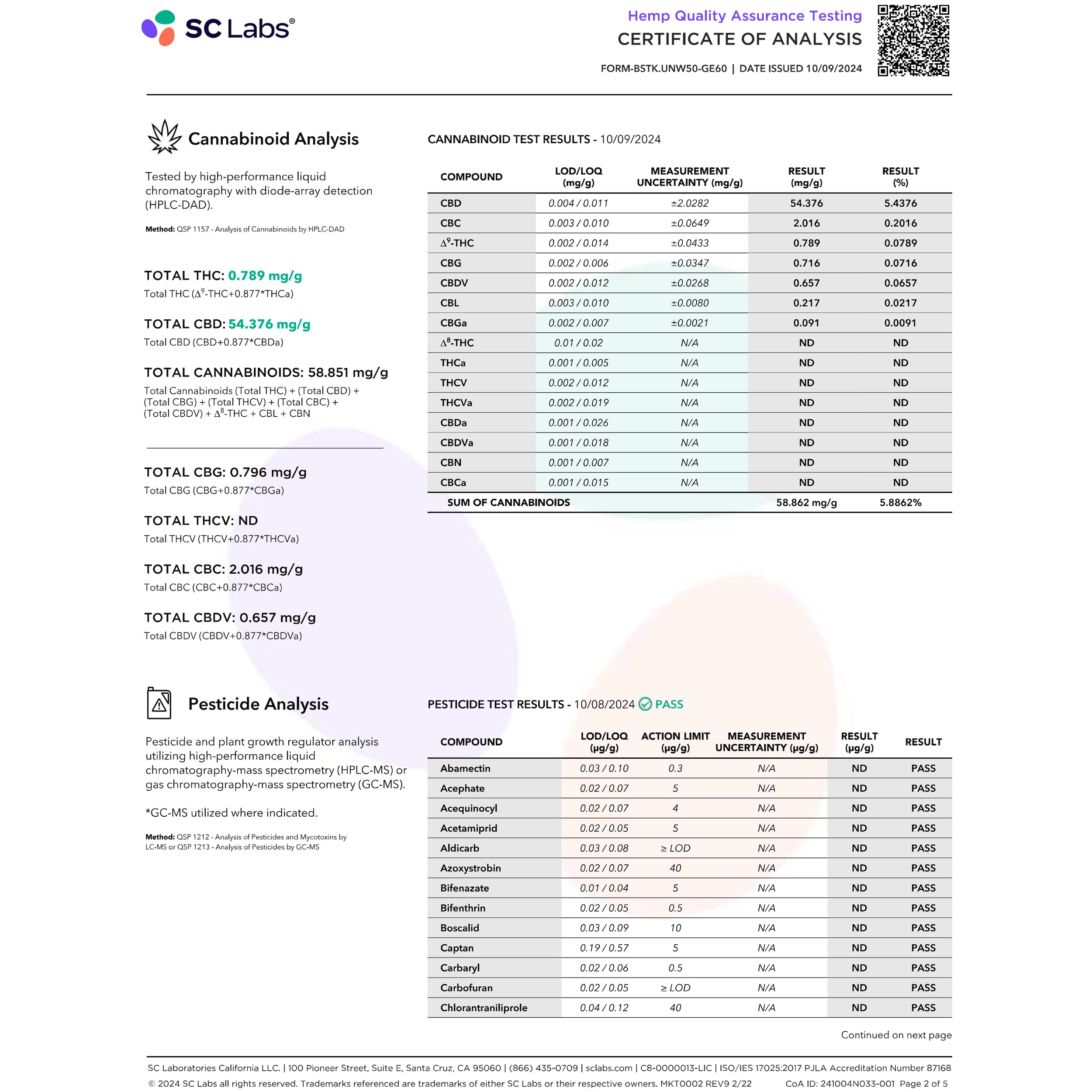 "\nAromatic Plant Research Center \n230 N 1200 E STE 100 \nLehi, UT 84043 \nwww.aromaticplant.org\n\n# Comprehensive Analysis Report\n\n## Sample Overview\n\n**Client:** HempLucid \n852 E 1910 S Unit 3, Provo, UT 84606 \n\n**Sample Name:** HL-MCT600NAT-CBD \n**Sample Matrix:** Tincture \n**Sample Lot:** 182021 \n\n**Date Received:** 10\/11\/2024 \n**APRC #:** HPL241014C \n\n| Assay | Disposition | Date Tested |\n| ------------------------------------------ | ----------- | ----------- |\n| Hemp or R\\&D Cannabinoid Testing (Potency) | Tested | 10-15-2024 |\n\n\nAccreditation #115229 \nAromatic Plant Research Center is an ISO 17025:2017 certified laboratory.\n\nCopyright \u00a9 2020 by Aromatic Plant Research Center (APRC). All rights reserved. The information in this test report may not be reproduced except in full. These results only apply to the samples included in this report.\n\nPage 1 of 2\n\n---\n\nAromatic Plant Research Center \n230 N 1200 E STE 100 \nLehi, UT 84043 \nwww.aromaticplant.org \n\n# Instrument Analysis Report\n\n## Potency\n\n**Method:** SOP 1-2026.03 \n**Sample Name:** HL-MCT600NAT-CBD \n**APRC Lot Number:** HPL241014C \n\n| Cannabinoid | RT | Total % | Total mg\/g |\n| --------------------------------------------------- | ----- | ------- | ---------- |\n| Cannabidivarinic Acid (CBDVA) | ND | ND | ND |\n| Cannabidivarin (CBDV) | ND | ND | ND |\n| Cannabidiolic Acid (CBDA) | ND | ND | ND |\n| Cannabigerolic Acid (CBGA) | ND | ND | ND |\n| Cannabinol (CBN) | \\<LOQ | \\<LOQ | \\<LOQ |\n| Cannabidiol (CBD) | 3.58 | 2.14 | 21.45 |\n| Cannabigerol (CBG) | 3.38 | 0.03 | 0.26 |\n| Tetrahydrocannabivarin (THCV) | ND | ND | ND |\n| Tetrahydrocannabivarin Acid (THCVA) | ND | ND | ND |\n| Delta-9-Tetrahydrocannabinol (\u03949-THC) | 6.75 | 0.07 | 0.74 |\n| Delta-8-Tetrahydrocannabinol (\u03948-THC) | ND | ND | ND |\n| Tetrahydrocannabinolic acid (THCA-A) | ND | ND | ND |\n| Cannabichromene (CBC) | 8.49 | 0.06 | 0.64 |\n| Cannabichromene Acid (CBCA) | ND | ND | ND |\n| \u039410 and \u03946a,10a-Tetrahydrocannabinol, mixed isomers | ND | ND | ND |\n| (6aR,9R)-\u039410-Tetrahydrocannabidiol | NT | NT | NT |\n| (6aR,9S)-\u039410-Tetrahydrocannabidiol | NT | NT | NT |\n| 9(R+S)-\u03946a,10a-Tetrahydrocannabidiol | NT | NT | NT |\n| Cannabitcitran (CBTC) | ND | ND | ND |\n\n\n**Performed by:** Tessa Crook \n**Reviewed by:** Riley Hunter \n\n| | % | mg\/g |\n| ------------------ | ---- | ----- |\n| Total Cannabinoids | 2.31 | 23.09 |\n| Total THCt | 0.07 | 0.74 |\n| Total CBDs | 2.14 | 21.45 |\n\n\n<sup>t<\/sup>Total Thc is calculated by \u03949-THC + (THCA-A*0.877) \n<sup>s<\/sup>Total CBD is calculated by CBD + (CBDA*0.877) \n\nLOD > 0.005% by mass, LOQ > 0.01% by mass \n\n**Approved By:** \nNicholas Saichek, PhD \nSenior Scientist Mass Spectrometry \n10\/17\/2024 \n\nCopyright \u00a9 2020 by Aromatic Plant Research Center (APRC). All rights reserved. The information in this test report may not be reproduced except in full. These results only apply to the samples included in this report. \nPage 2 of 2\n"