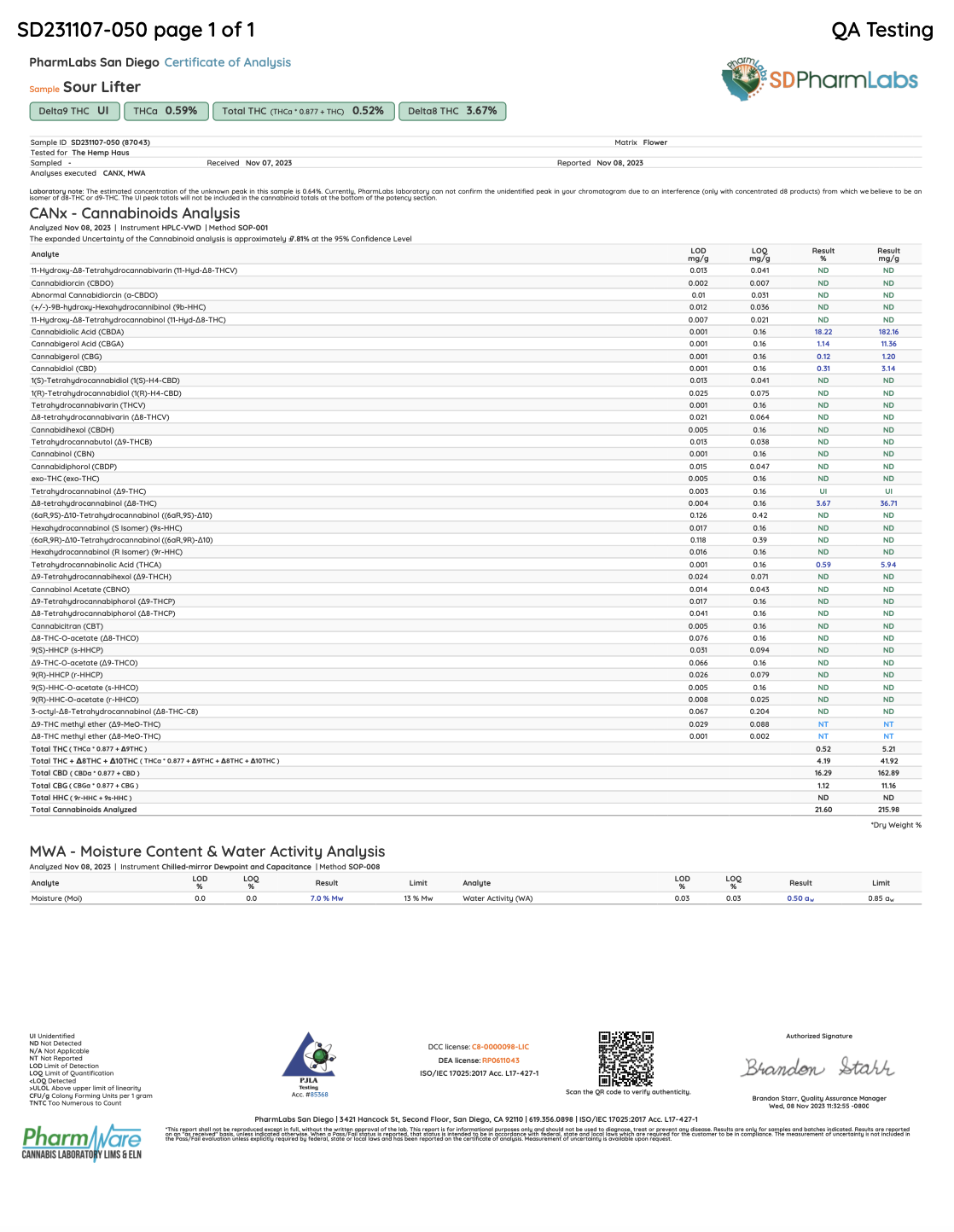 "# PharmLabs San Diego Certificate of Analysis\n\n3421 Hancock St, Second Floor, San Diego, CA 92110 | License: C8-0000098-LIC\nISO\/IEC 17025:2017 Certification L17-427-1 Accreditation #85368\n\n## Sample: Sour Peach\n\n- **Sample ID:** SD220518-003 (48400)\n- **Matrix:** Edible (Other Cannabis Good)\n- **Tested for:** Savage\n- **Sampled:** Received May 17, 2022\n- **Reported:** May 18, 2022\n- **Analyses executed:** QARUSH, CAN20\n- **Unit Mass (g):** 45.874\n- **Serving Size (g):** 5.097\n\n### Laboratory Note\n\n- Unit size = 9 pieces\n- The estimated concentration of the unknown peak in the sample is 0.34%\n- Currently, PharmLabs laboratory cannot confirm an unidentified peak in your chromatogram due to interference (only with highly concentrated D8 products) from which we believe to be either (\u00b1)d8-THC or d9-THC.\n- At this time there are no reference standards available for (\u00b1)d8-THC. (\u00b1)d8-THC is a different compound from the main (-)d8-THC cannabinoid and, therefore, these two compounds may have different efficacies.\n- Using the most advanced instruments and techniques available, the separation of (\u00b1)d8-THC and d9-THC is problematic for the scientific community as a whole.\n- PharmLabs believes the unidentified peak to be a combination of (\u00b1)d8-THC and d9-THC with the majority, if not all, of the concentration being (\u00b1)d8-THC.\n\n## CAN20 - Cannabinoids Analysis\n\n- **Analyzed:** May 18, 2022 | **Instrument:** HLPC\n- **Measurement Uncertainty at 95% confidence:** 7.806%\n\n| Analyte | LOD mg\/g | LOQ mg\/g | Result % | Result mg\/g | Result %\/Serving | Result mg\/Package |\n| ------------------------------------------------ | -------- | -------- | -------- | ----------- | ---------------- | ----------------- |\n| Cannabidivarin (CBDV) | 0.039 | 0.16 | 0.01 | 0.08 | 0.42 | 3.76 |\n| Cannabidiolic Acid (CBDA) | 0.001 | 0.16 | 0.00 | ND | 0.02 | 1.06 |\n| Cannabigerol Acid (CBGA) | 0.001 | 0.16 | ND | ND | ND | ND |\n| Cannabigerol (CBG) | 0.001 | 0.16 | 0.00 | 0.01 | 0.06 | 0.53 |\n| Cannabidiol (CBD) | 0.001 | 0.16 | 0.00 | 0.10 | 0.52 | 4.68 |\n| exo-THC (exo-THC) | 0.016 | 0.16 | ND | ND | ND | ND |\n| Tetrahydrocannabinol (\u03949-THC) | 0.003 | 0.16 | 1.97 | 19.70 | 100.41 | 903.72 |\n| \u03948-tetrahydrocannabinol (\u03948-THC) | 0.004 | 0.16 | ND | ND | ND | ND |\n| (6aR,9S)-\u039410-Tetrahydrocannabinol ((6aR,9S)-\u039410) | 0.015 | 0.16 | ND | ND | ND | ND |\n| Hexahydrocannabinol (S Isomer) (9S-HHC) | 0.017 | 0.16 | ND | ND | ND | ND |\n| (6aR,9R)-\u039410-Tetrahydrocannabinol ((6aR,9R)-\u039410) | 0.015 | 0.16 | ND | ND | ND | ND |\n| Hexahydrocannabinol (R Isomer) (9R-HHC) | 0.017 | 0.16 | ND | ND | ND | ND |\n| Cannabichromene (CBC) | 0.001 | 0.16 | ND | ND | ND | ND |\n| Tetrahydrocannabinolic Acid (THCA) | 0.002 | 0.16 | ND | ND | ND | ND |\n| \u03949-Tetrahydrocannabiphorol (\u03949-THCP) | 0.017 | 0.16 | ND | ND | ND | ND |\n| \u03948-Tetrahydrocannabiphorol (\u03948-THCP) | 0.041 | 0.16 | ND | ND | ND | ND |\n| \u03948-THC-o-acetate (\u03948-THC-O) | 0.066 | 0.16 | ND | ND | ND | ND |\n| \u03949-THC-o-acetate (\u03949-THC-O) | 0.066 | 0.16 | ND | ND | ND | ND |\n| Total THC (THCA \\* 0.877 + THC) | | | 1.97 | 19.70 | 100.41 | 903.72 |\n| Total CBD (CBDA \\* 0.877 + CBD) | | | 0.00 | 0.02 | 0.10 | 0.93 |\n| Total CBG (CBGA \\* 0.877 + CBG) | | | 0.00 | 0.01 | 0.06 | 0.53 |\n| Total HHC (9R-HHC + 9S-HHC) | | | ND | ND | ND | ND |\n| Total CANNABINOIDS | | | 1.99 | 19.90 | 101.42 | 913.09 |\n\n### Notes\n\n- UI: Not Identified\n- ND: Not Detected\n- NA: Not Applicable\n- NR: Not Reported\n- LOD: Limit of Detection\n- LOQ: Limit of Quantification\n- <LOQ: Detected\n- >ULOQ: Above upper limit of linearity\n- Gravity Colony Farming Units per g: CFU\/g\n- TNTC: Too Numerous to Count\n\n----\n\n**Authorized Signature:**\nBrandon Stahl, Lab Manager\nWed, 18 May 2022 11:55:31 -0700\n\n**Contact:**\nPharmLabs San Diego | 3421 Hancock St, Second Floor, San Diego, CA 92110 | 619.356.0899 | ISO\/IEC 17025:2017 Certification L17-427-1\n\n*This report is for informational purposes only and should not be used to diagnose, treat, cure, or prevent any disease. Results are intended to be in accordance with federal, state, and local laws.*"