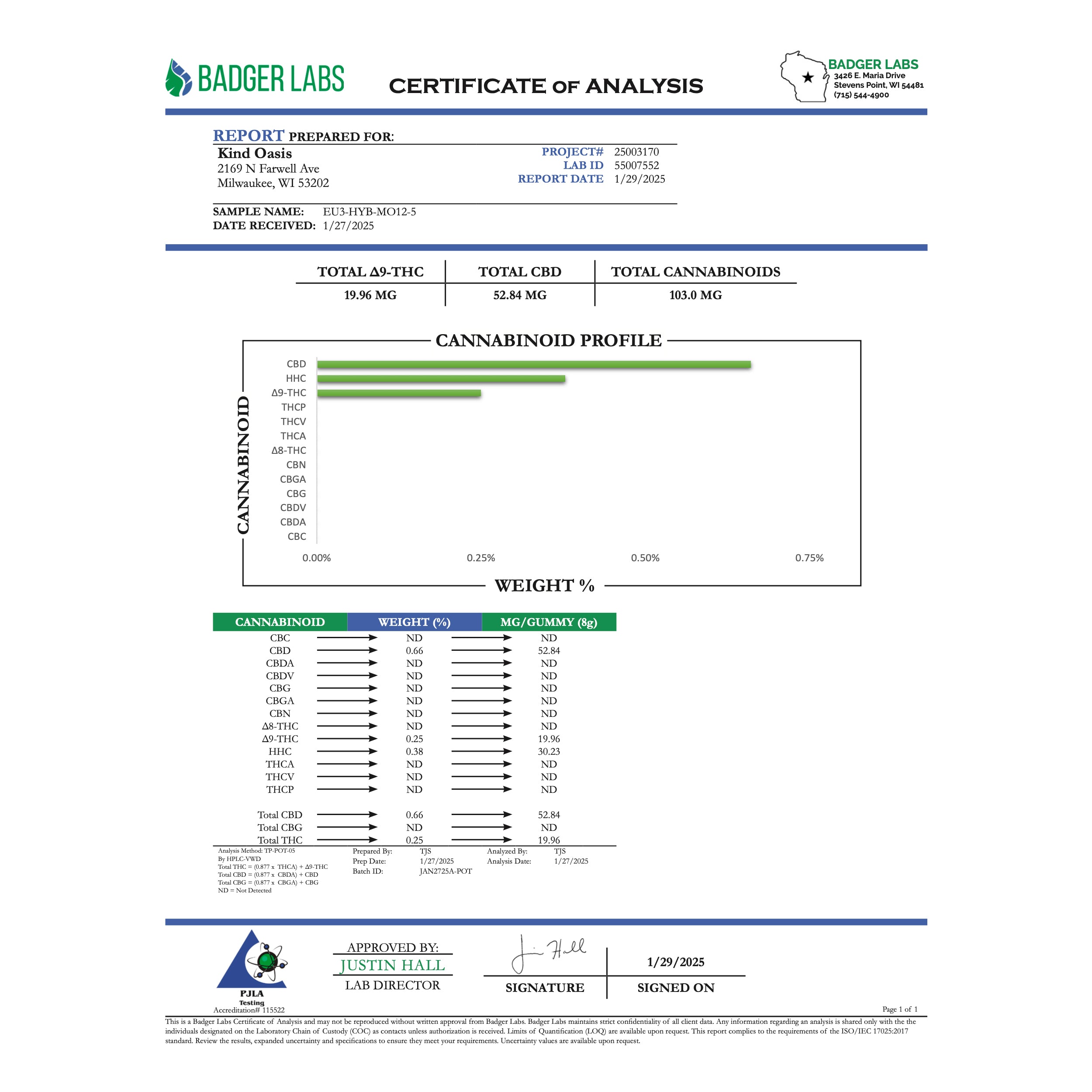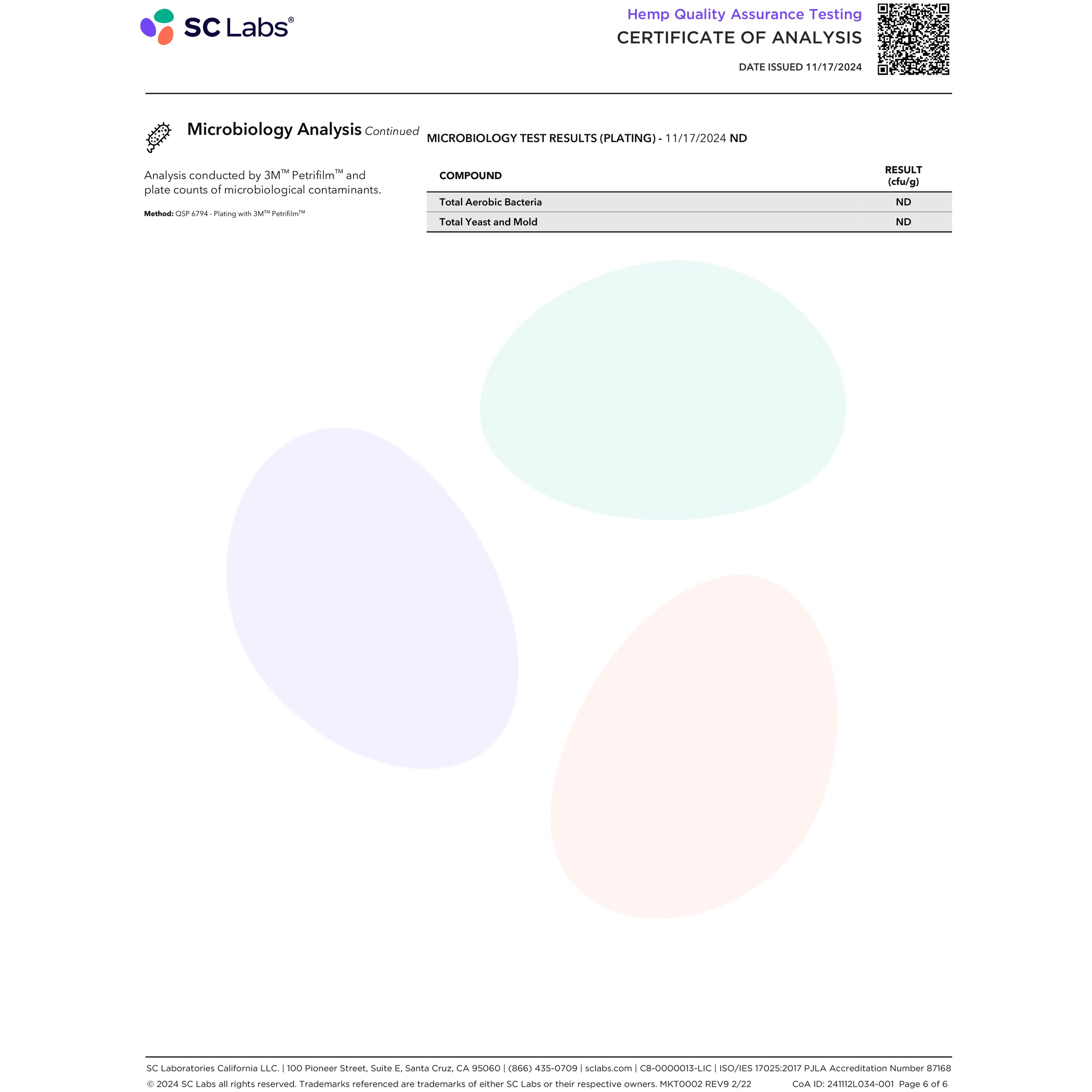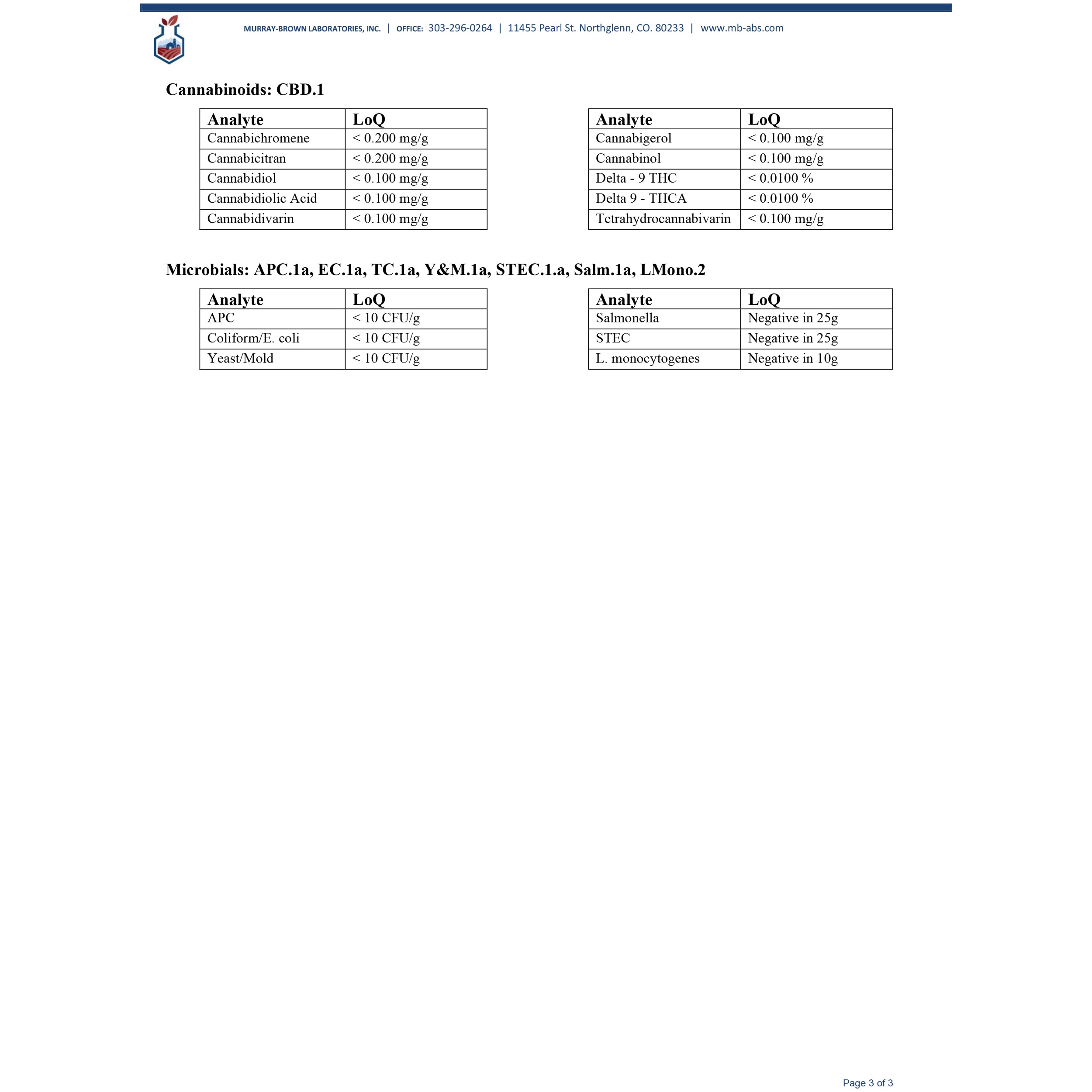 "\nENCORE LABS \nEncore Labs \n75 N Vinedo Ave. \nPasadena, CA 91107 \n(626) 696-3086 \nhttps:\/\/encore-labs.com \nLic# C8-0000086-LIC \nR&D Testing \nCertificate of Analysis \n1 of 1\n\n# Minis\n\n**METRC Batch:** \n**METRC Sample:** \n**Sample ID:** 2403ENC2577_7750 \n**Strain:** Mini \n**Matrix:** Ingestible \n**Type:** Soft Chew \n**Batch#:** 00274 \n\n**Collected:** 03\/21\/2024 \n**Received:** 03\/21\/2024 \n**Completed:** 03\/22\/2024 \n**Sample Size:** 1 units; \n\n**Distributor** \nKing B Distribution \n**Lic. #** \n502 W 8360 S, \nSandy, CA, 84020 \n\n----\n\n![Image of product]\n\n## Summary\n\n| Test | Date Tested | Instr. Method | Result |\n|-------------|-------------|---------------|----------|\n| Cannabinoids| 03\/21\/2024 | LC-DAD | Pass |\n\n----\n\n## Cannabinoids\n\n**Method:** SOP EL-CANNABINOIDS\n\n| | 9.72 mg\/unit | 10.42 mg\/unit | 20.14 mg\/unit |\n|----------------|--------------|---------------|---------------|\n| | Total THC | Total CBD | Total Cannabinoids |\n\n### Analytes\n\n| Analytes | LOQ | Result | Result | Result | |\n| ------------------- | ----- | ------ | ------ | ------ | ----- |\n| THCa | 0.012 | 0.037 | ND | ND | |\n| \u03949-THC | 0.012 | 0.039 | 0.285 | 2.85 | 9.72 |\n| \u03948-THC | 0.014 | 0.044 | ND | ND | |\n| THCVa | 0.015 | 0.043 | ND | ND | |\n| THCV | 0.013 | 0.039 | ND | ND | |\n| CBDa | 0.012 | 0.036 | ND | ND | |\n| CBD | 0.012 | 0.036 | 0.306 | 3.06 | 10.42 |\n| CBN | 0.012 | 0.036 | ND | ND | |\n| CBGA | 0.013 | 0.043 | ND | ND | |\n| CBG | 0.013 | 0.039 | ND | ND | |\n| CBCA | 0.012 | 0.035 | ND | ND | |\n| CBC | 0.013 | 0.041 | ND | ND | |\n| Total THC | | 0.285 | 2.85 | 9.718 | |\n| Total CBD | | 0.306 | 3.06 | 10.418 | |\n| Total Cannabinoids | | 0.590 | 5.90 | 20.135 | |\n| Sum of Cannabinoids | | 0.590 | 5.90 | 20.135 | |\n\n\n1 Unit = 3.41g; \nTotal THC = THCa * 0.877 + \u03949-THC + \u03948-THC; Total CBD = CBDa * 0.877 + CBD; Total Cannabinoids = (cannabinoid acid forms * 0.877) + cannabinoids; Sum of Cannabinoids = cannabinoid acid forms + cannabinoids; LOQ = Limit of Quantitation; LOD = Limit of Detection; NT = Not Tested; ND = Not Detected. The reported result is based on a sample weight with the applicable moisture content for that sample. Foreign Material Method: SOP EL-FOREIGN; Moisture and Water Activity Method: SOP EL-WATER\n\n----\n\nKevin Nolan \nLaboratory Director | 03\/22\/2024 \n\nThis report is not a California regulatory compliance certificate, it is for R&D\/Quality Assurance purposes only. Values reported relate only to the product tested. Sample was tested as received from client. Encore Labs makes no claims as to the efficacy, safety or other risks associated with any detected or non-detected levels of any compounds reported herein. This Certificate shall not be reproduced except in full, without the written approval of Encore Labs."